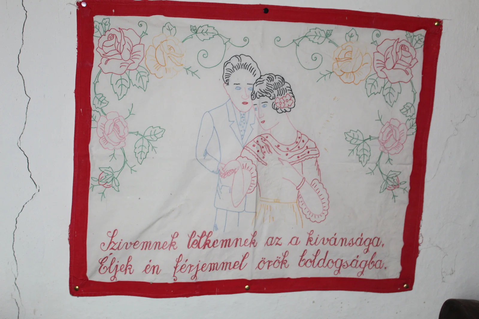 Leírás: Piros, kék, zöld, sárga, fehér hímzőszállal, szár- és laposöltéssel hímzett falvédő. Piros anyaggal van beszegve. Motívuma: szrelmes pár rózsákkal. Felirata: "Szívemnek lelekemnek az a kívánsága, éljek én férjemmel örök boldogságba."