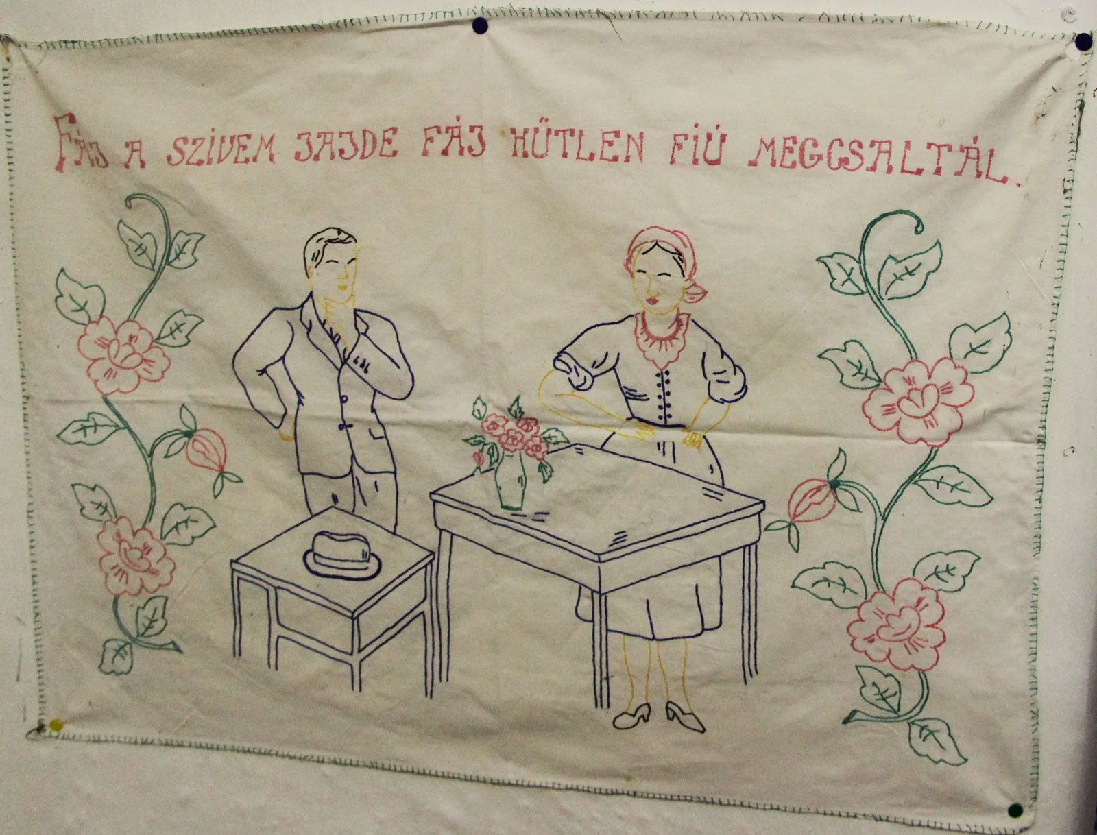 Leírás: "Fáj a szivem, jaj de fáj, hűtlen fiú, megcsalátál." Konyhai jelenet két alakkal. Szegélye pelenkaöltéssel készült.