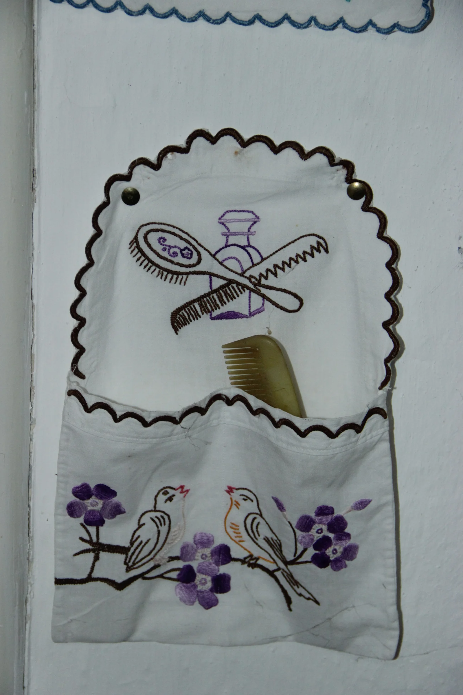Leírás: Kétzsebű. Lila, barna, piros, narancssárga hímzőszállal hímezve. Motívuma fésűk, a zsebeken két madár virágos ágon. Sötétbarna cakkszegéllyel.