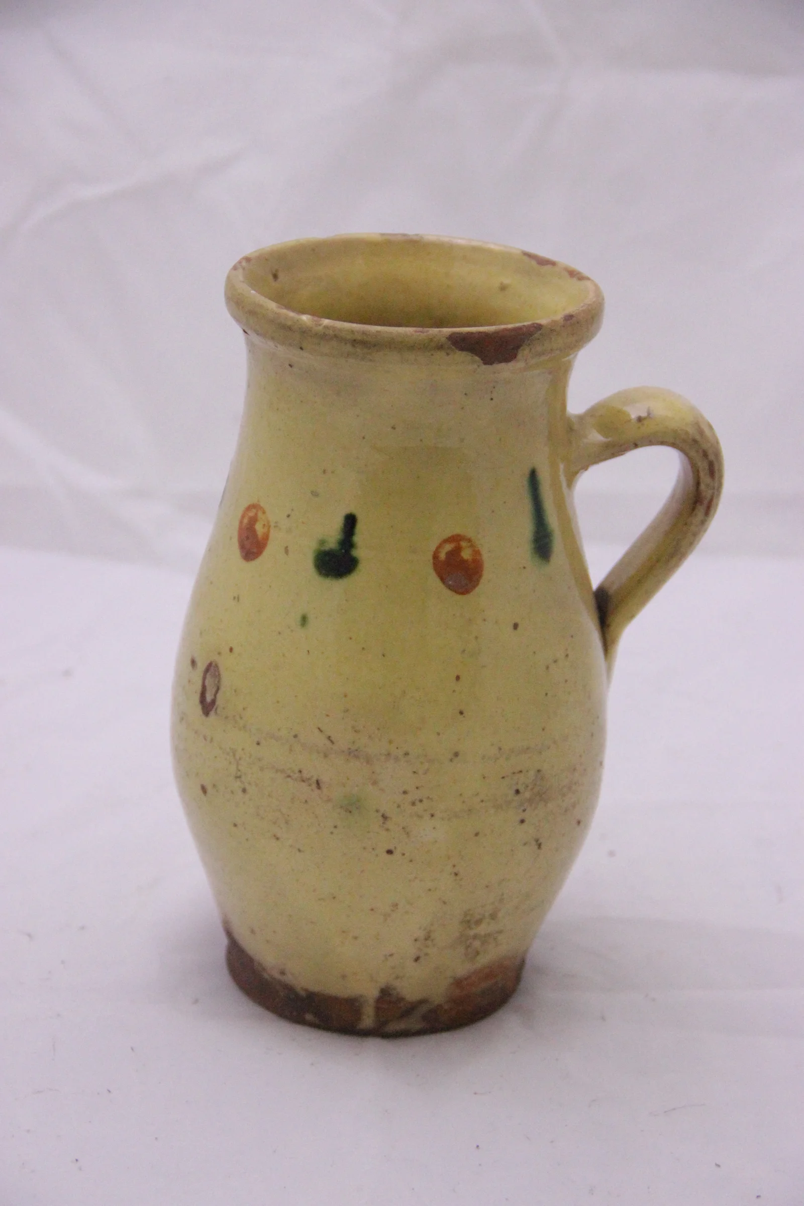 Leírás: Vajszínű mázzal. Mintája váltakozó rozsdabarna és zöld színű pöttyökből áll. Fenekén T-betű.