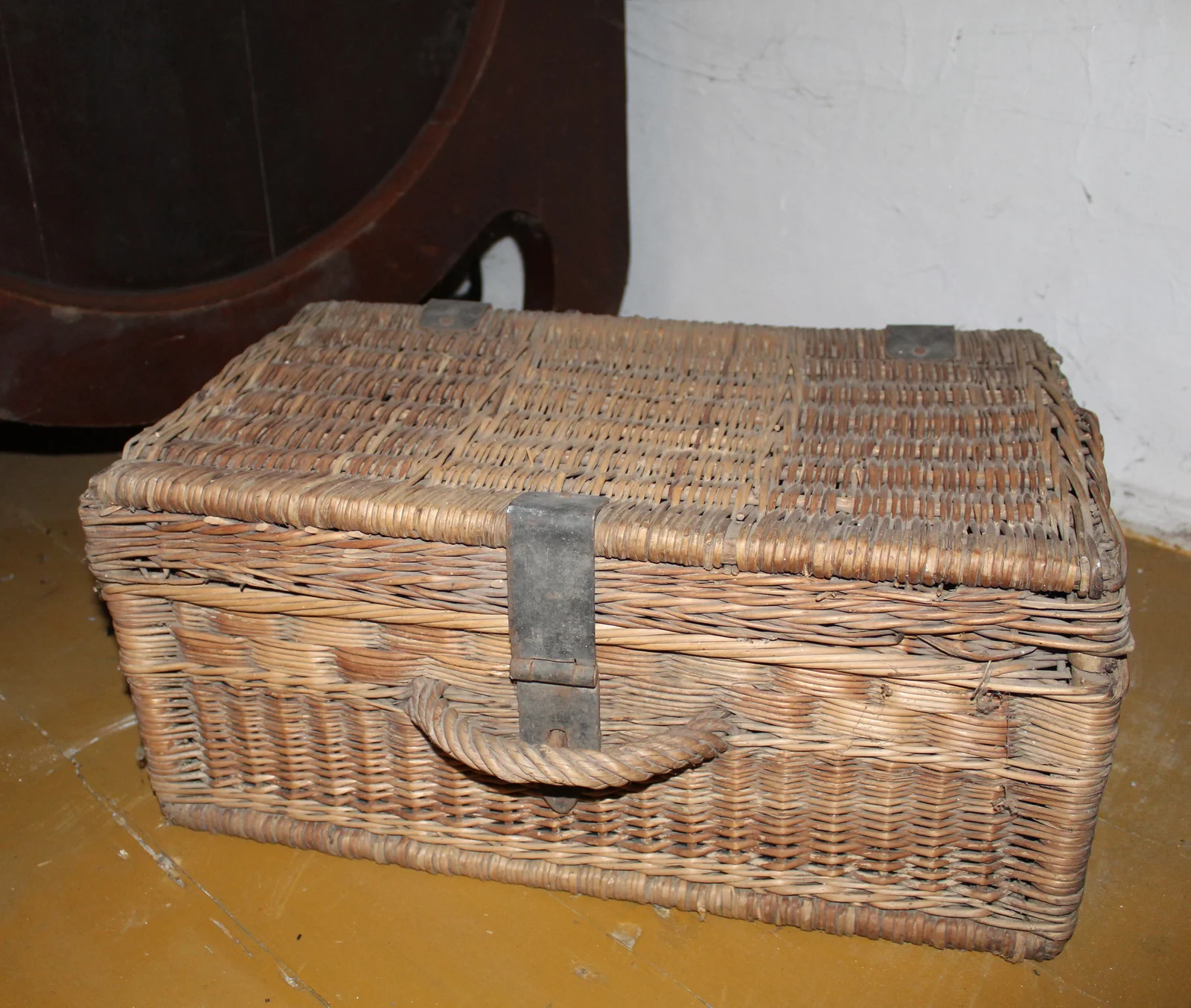 Leírás: Vesszőből font utazókoffer, vaspántokkal.