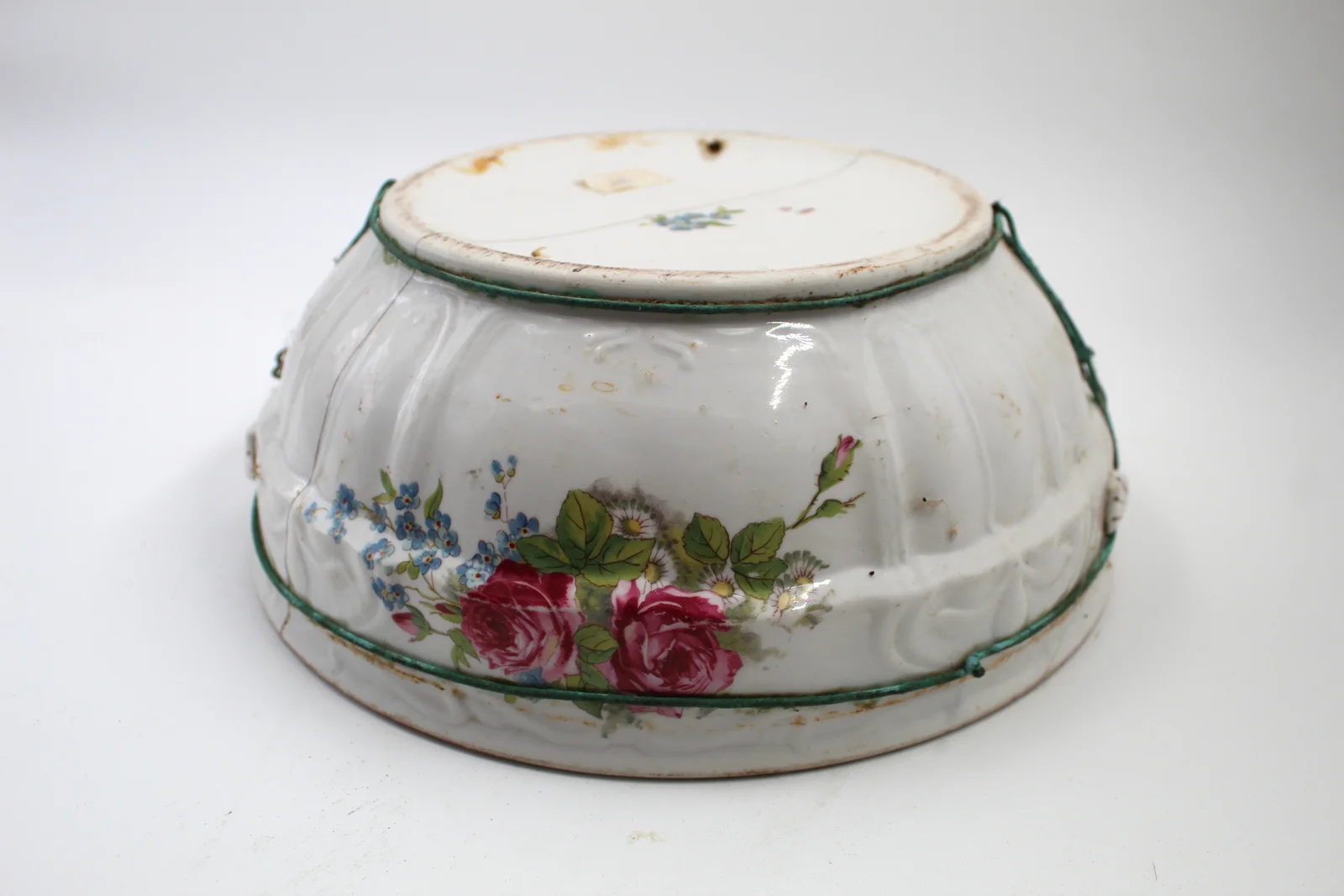 Leírás: Drótozott, fehér, rózsás mintájú porcelán levesestál, fenekén nefelejts díszítés és szám.