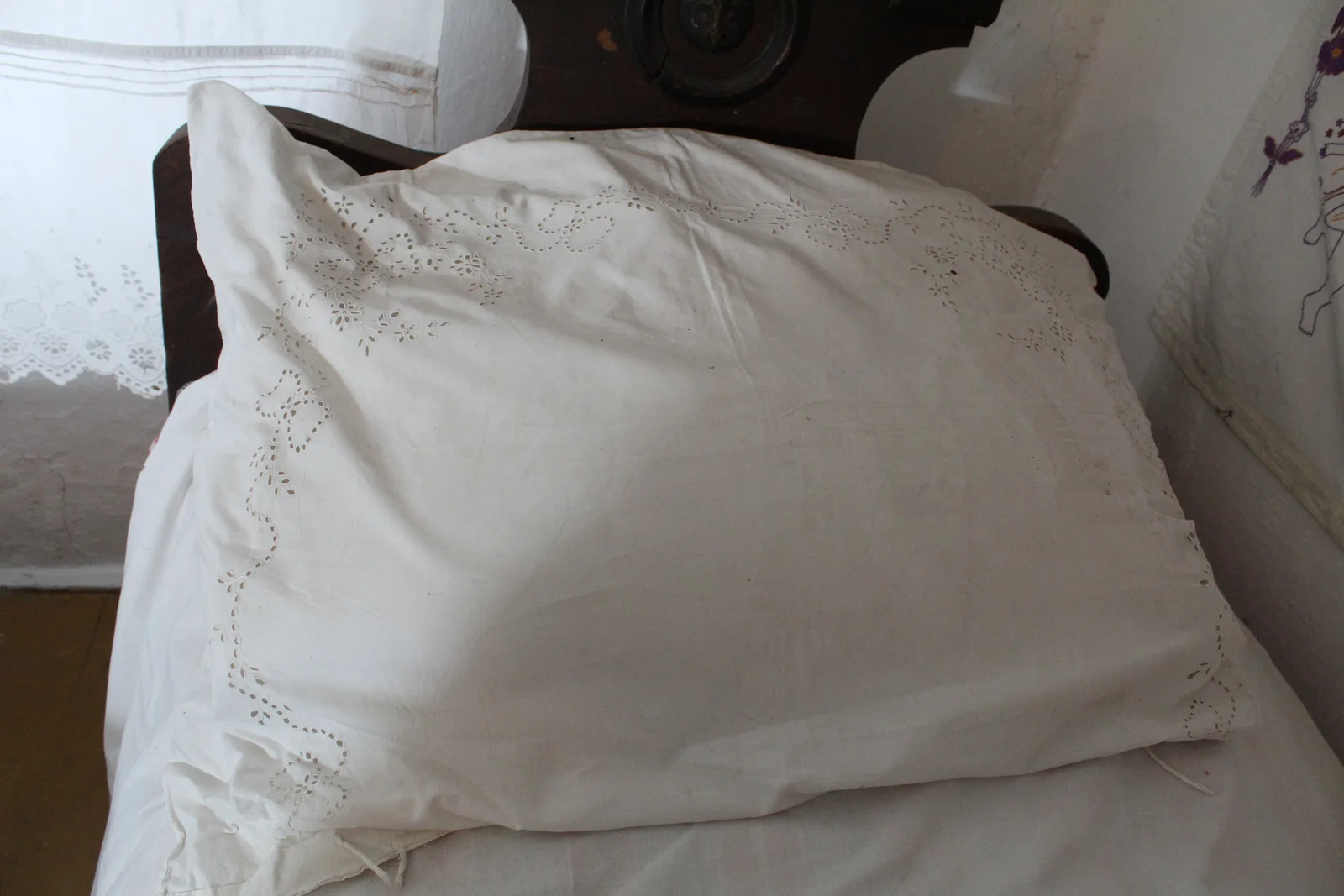 Leírás: Lyukhímzéses díszítménye a párna lapján van elhelyezve. Megkötőzsinórokkal zárható.