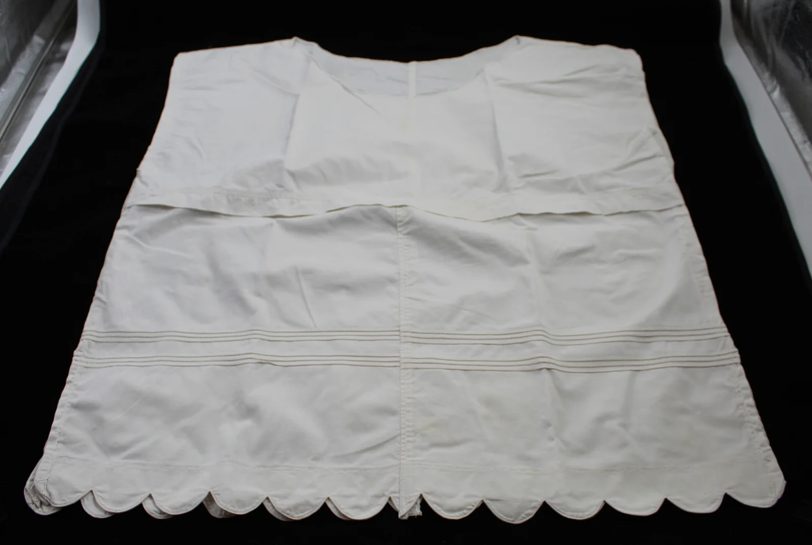 Leírás: Több részből összeállítótt, egyesenre szabott ruhadarab (talán valami másból átalakított darab). Nyakkivágása szokatlanul széles. Alján 3-3 pié. Aja cakkosra van szabva.