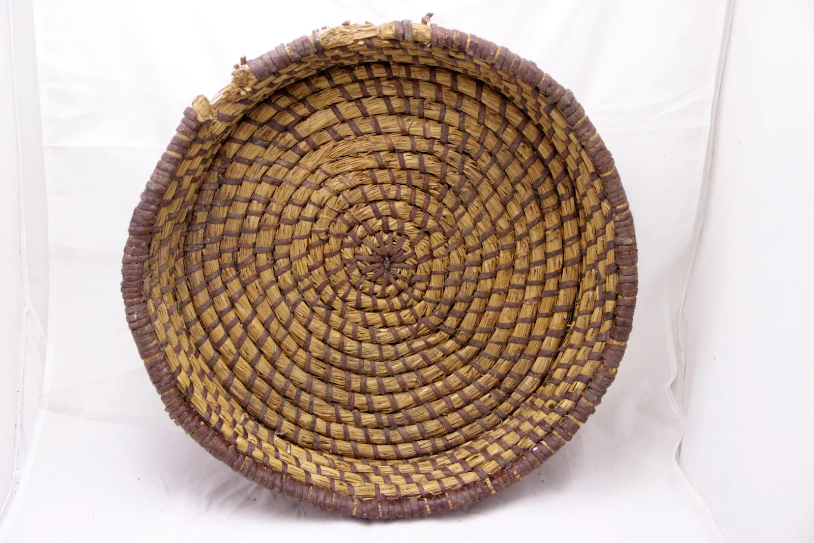 Leírás: Szabályosan körben font, a vesszőfonás ritmusa szabályosan halad. A széle két helyen sérült (egérrágás?).