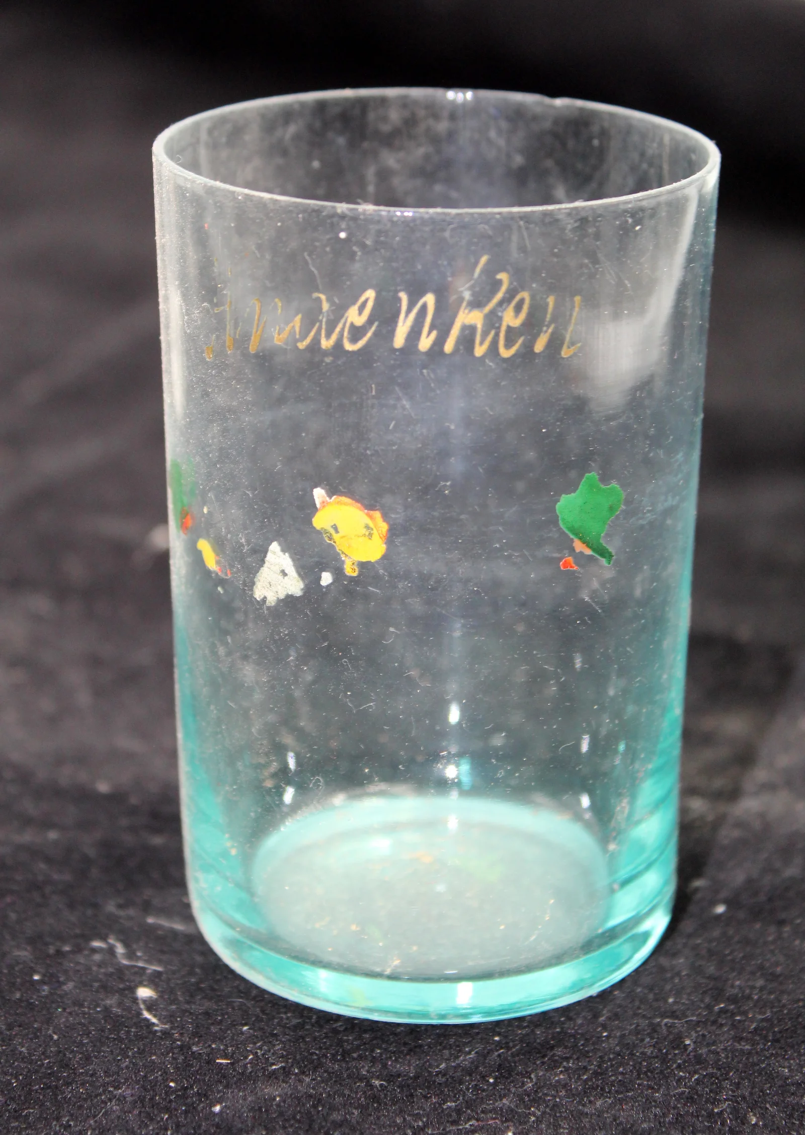 Leírás: Kékes színű üvegből. Arany színű felirata és sárga, zöld festett díszítménye erősen kopott.