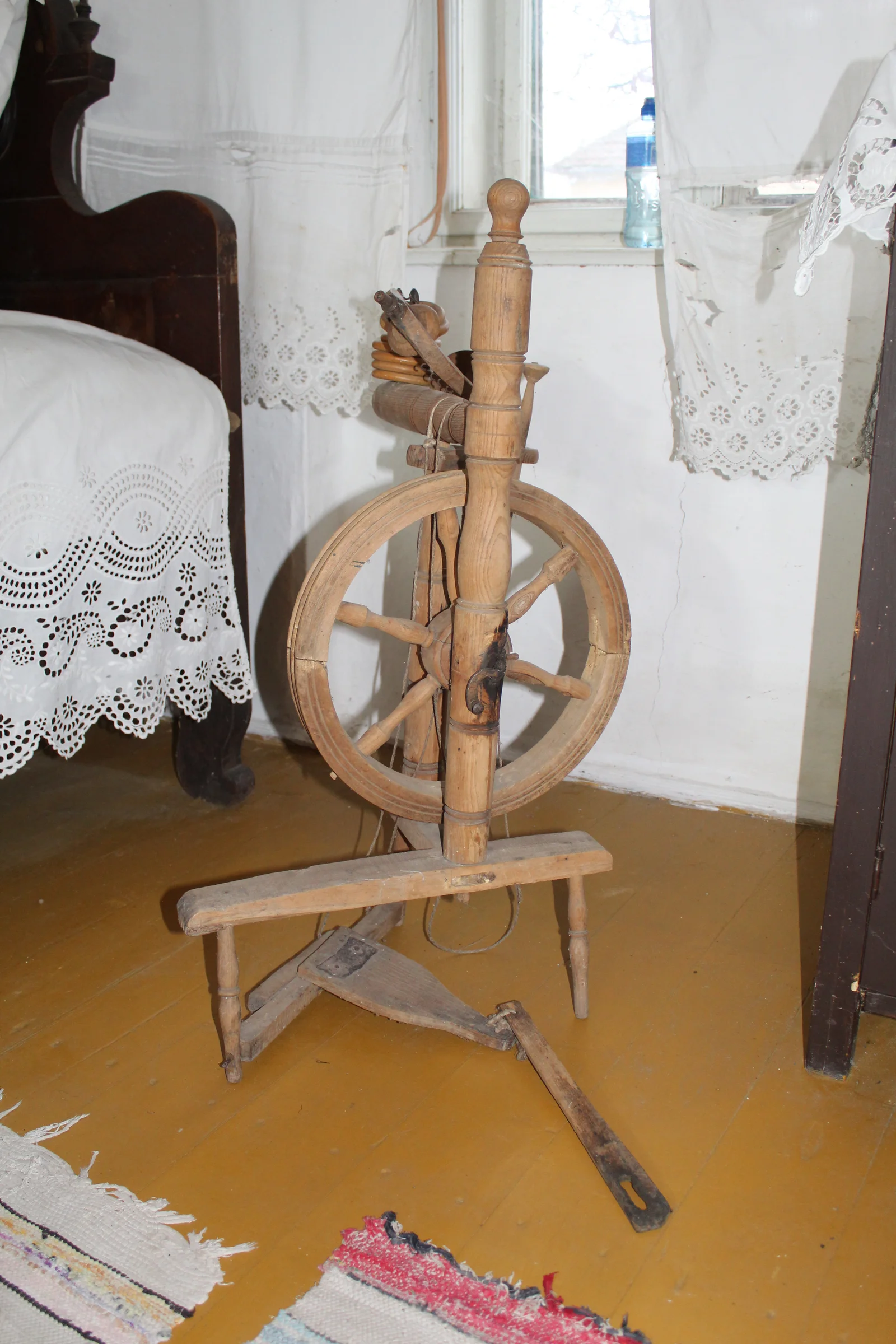 Leírás: Lábbal hajtós, esztergált faelemekből összerakott rokka.