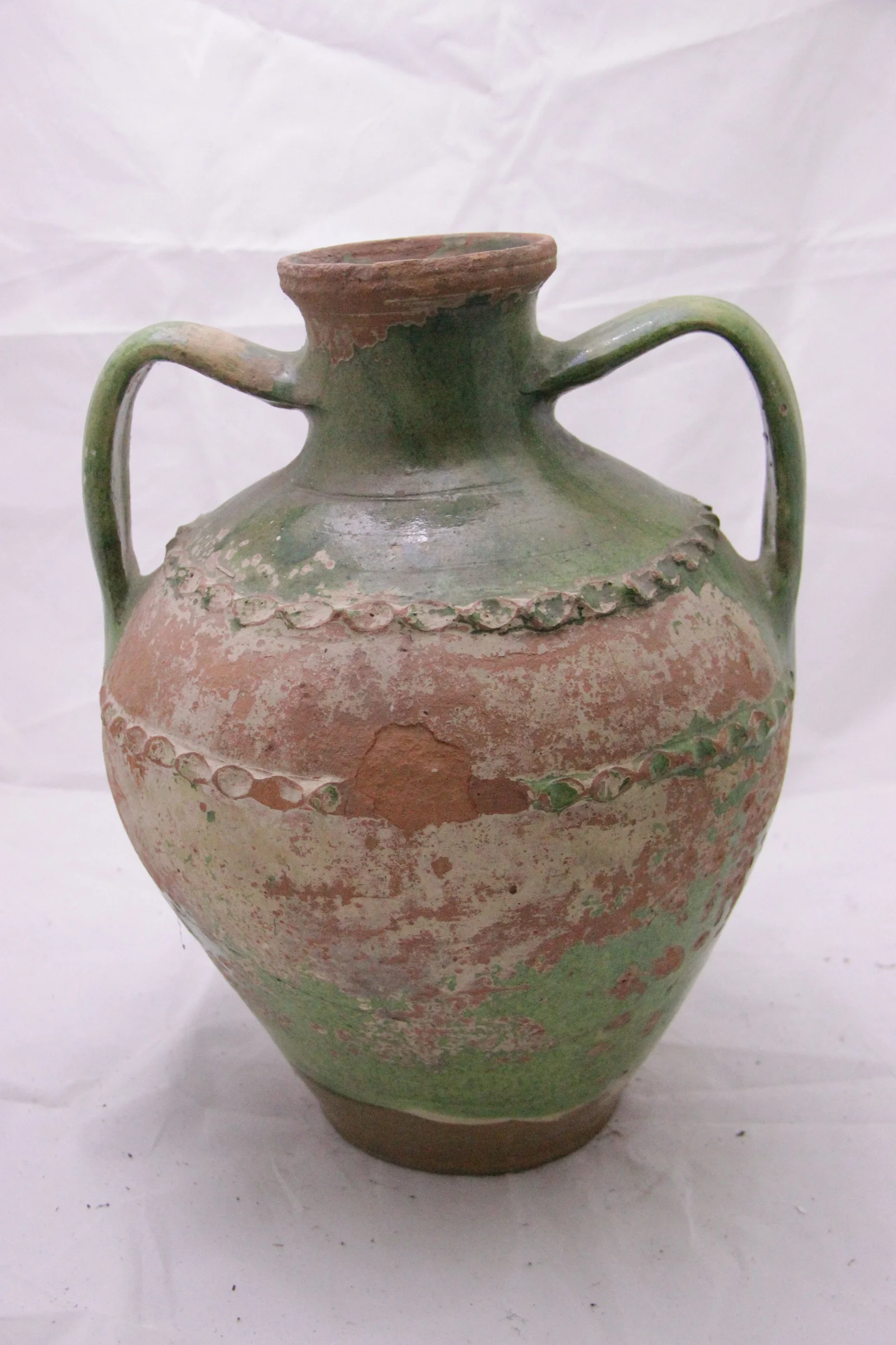 Leírás: Kívül belül mázas. Zöld. Erősen kopott a máz. Díszítése a gömöri fazekasokra jellemző (benyomott szalagminta).