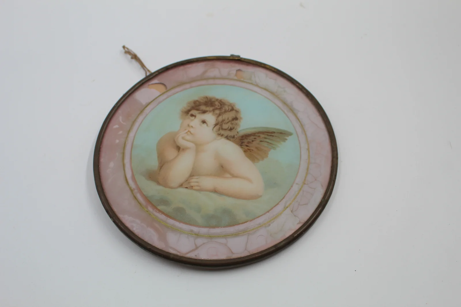 Leírás: Kerek, angyalt ábrázoló színes szentkép hajlított fémkerertben.