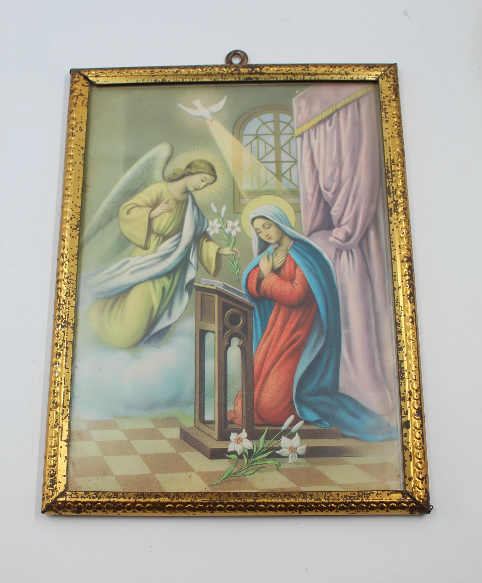 Leírás: Az angyali üdvözletet ábrázoló olajnyomat aranyszínű keretben.