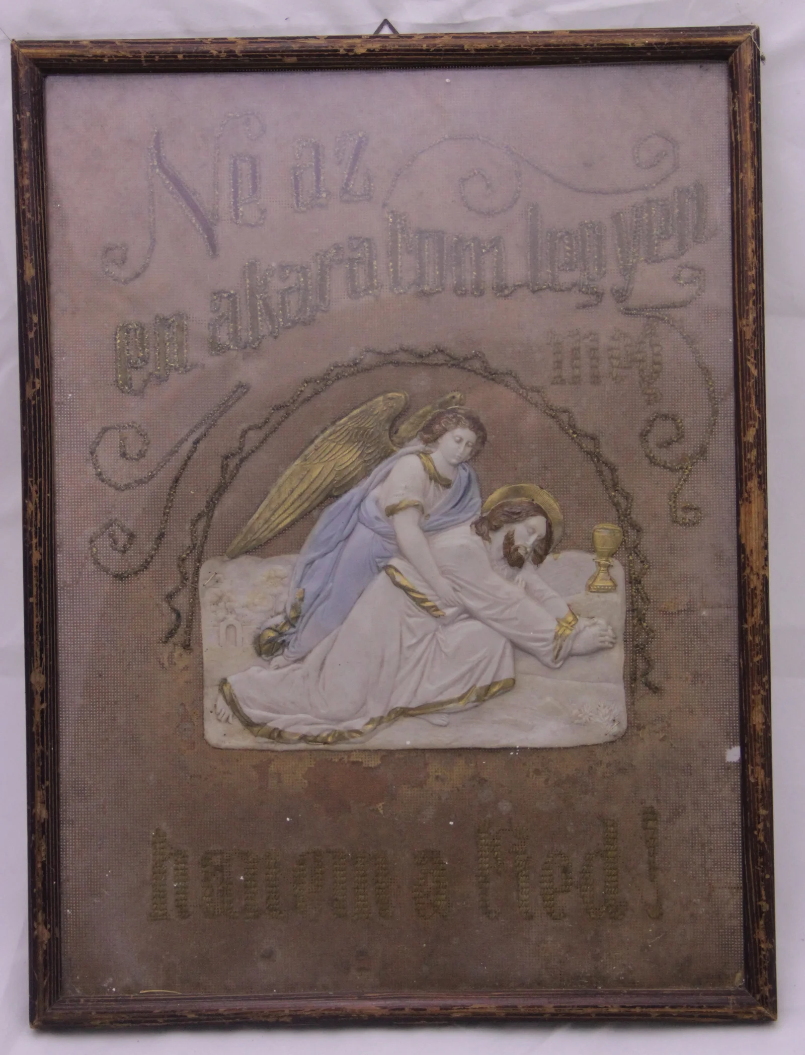 Leírás: A kép alapját képező lukacsos alapanyagon hímzett felirat található: "Ne az én akaratom legyen meg hanem a tied!" A felső két sor betűi arany-hímzőszállal vannak kontúrozva. A kép közepén műanyag relief, amely az Olajfák hegyén imádkozó Krisztust ábrázolja angyallal és kehellyel. Egyszerű fakerete van.