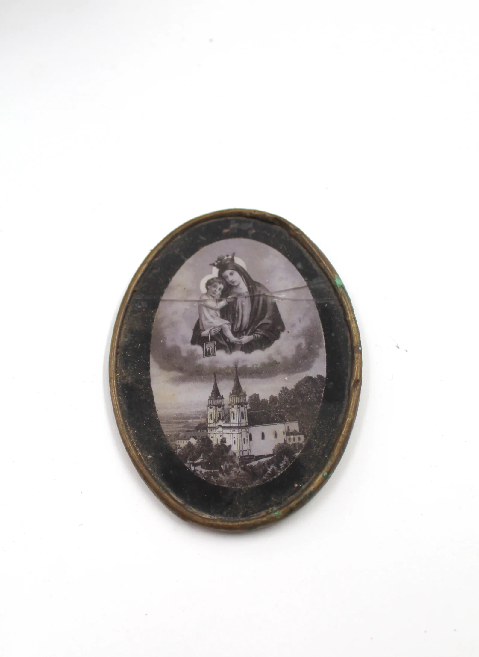 Leírás: Ovális alakú fekete-fehér szentkép vékony fémkeretben. Búcsús emlék. A képen a Szűzanya, karján a gyermek Jézussal, alatta a Máriaradnai kegyhely látképe.
