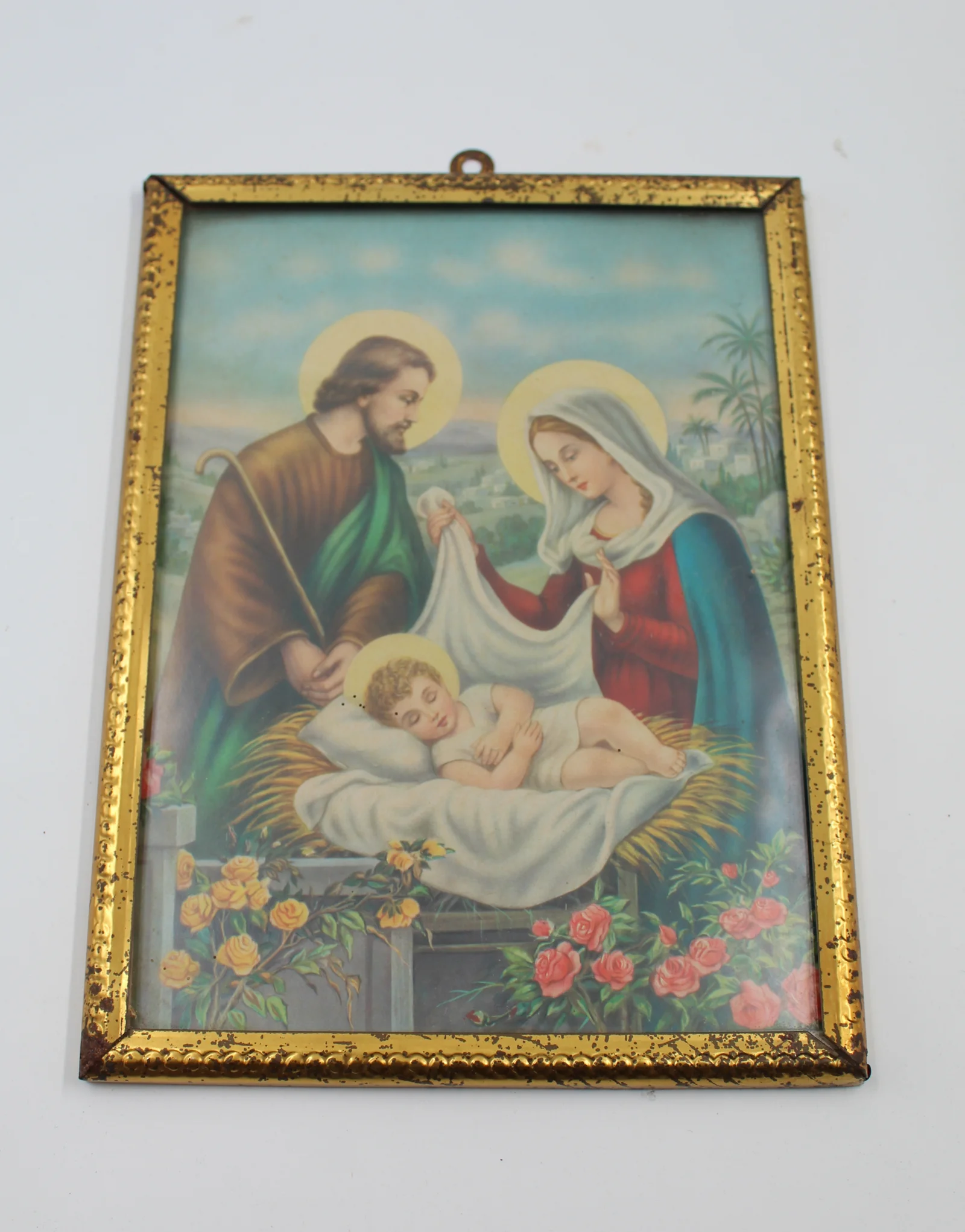 Leírás: A Szent Családot ábrázoló olajnyomat aranyszínű keretben.