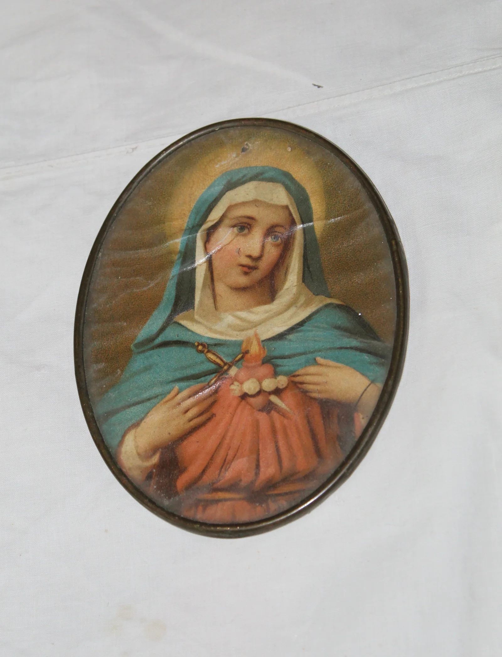 Leírás: Ovális alakú szentkép vékony fémkeretben.