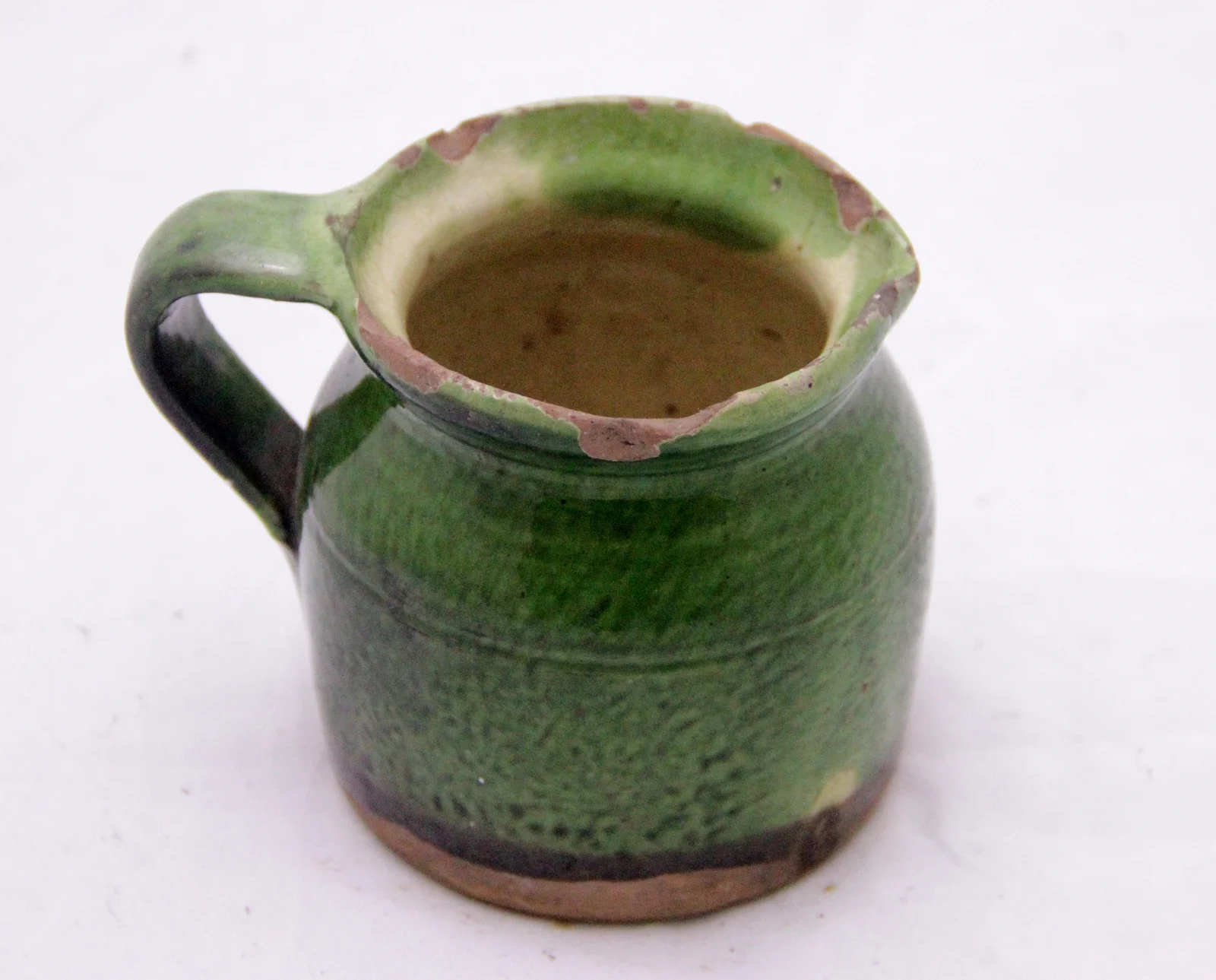 Leírás: Kívül-belül mázas. Külseje zöld ólommázas, belsejébe vajszinű máz van csorgatva. Peremén kiöntőcsűcs.