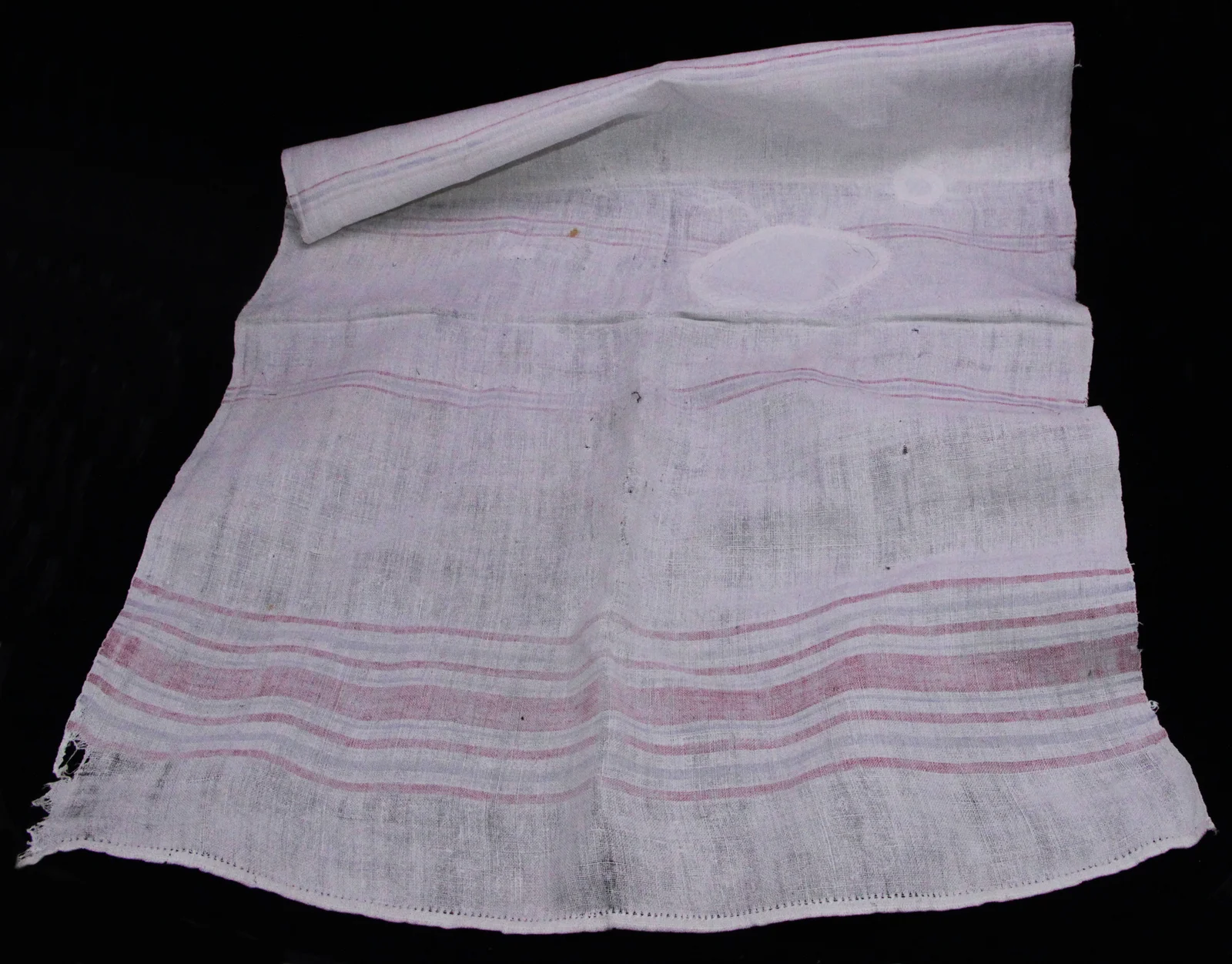 Leírás: Piros és kék csíkritmusos díszítés. Vége szegőazsúrral eldolgozva. Hétköznapi törölköző. Több helyen foltozott.