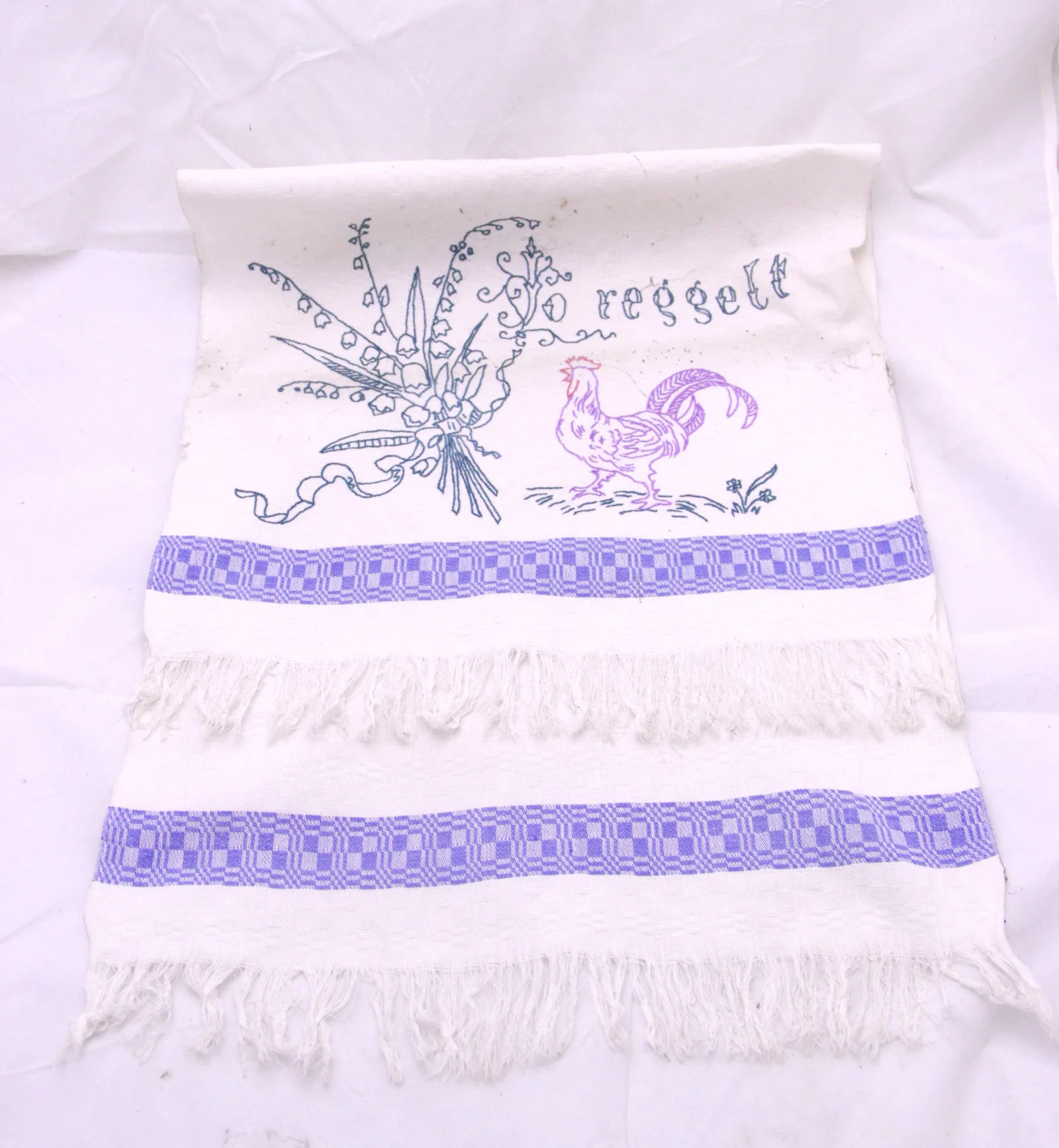 Leírás: Damaszt szőttes. Lila négyzetes mintával a két végén. Rojtos a vége. Indigókék, lila és piros hímzőszállal hímezve. Motívuma gyöngyvirágcsokor és kakas. Felirata: "Jó reggelt"