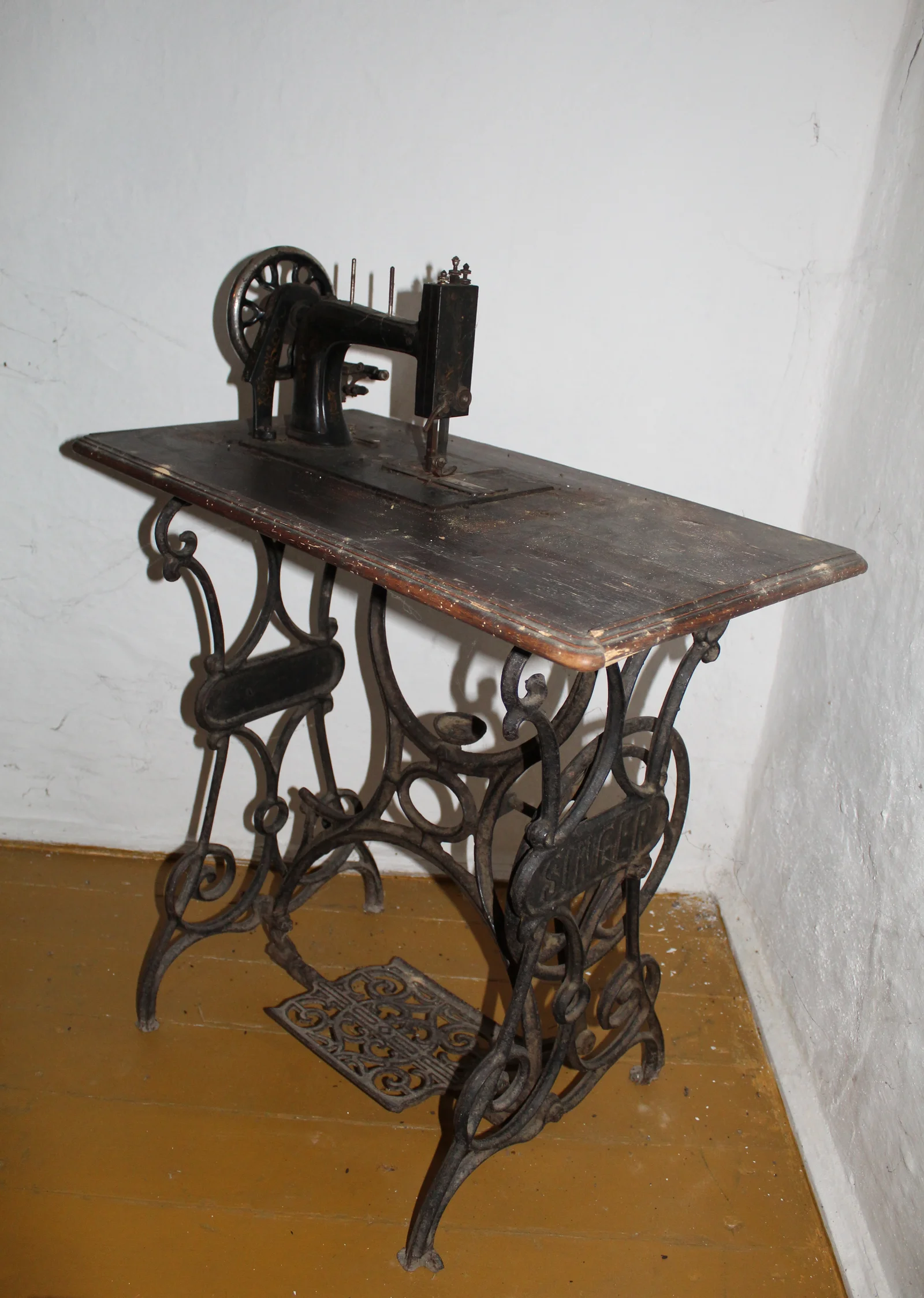 Leírás: Lábbal hajtós Singer varrógép. Fa-védődoboza nem illeszkedik a varrógéphez, talán egy másik darabhoz tartozott eredetileg.