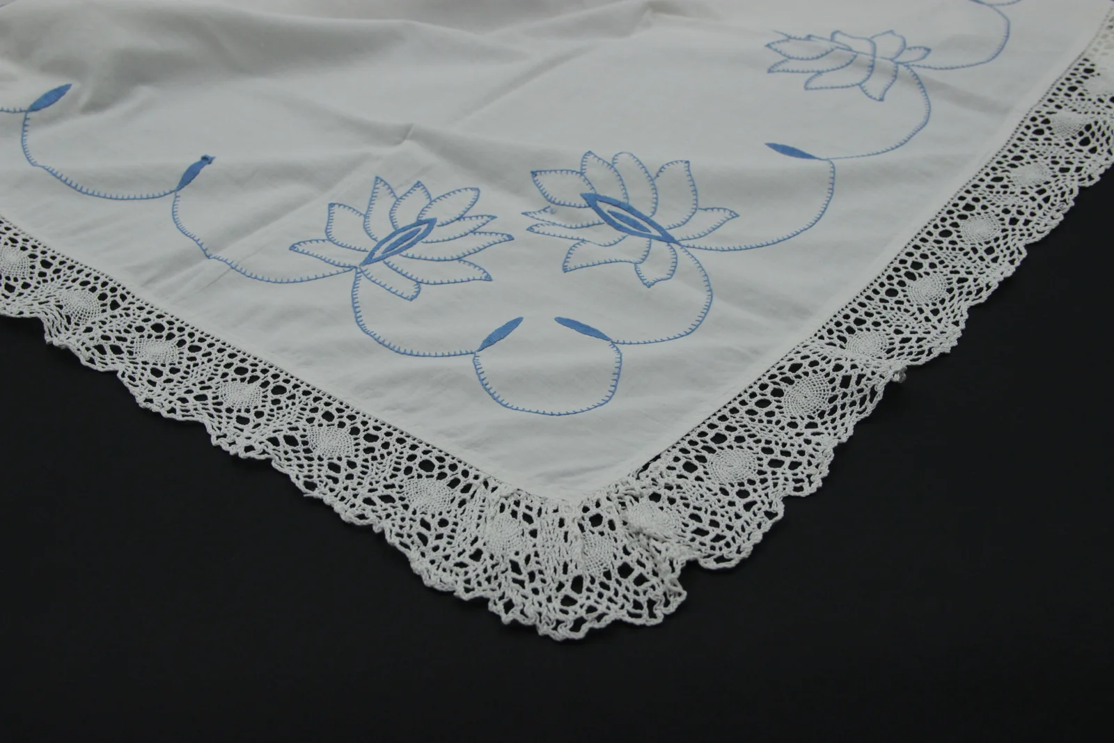 Anyag és technika: fehér vászon, hímzett
