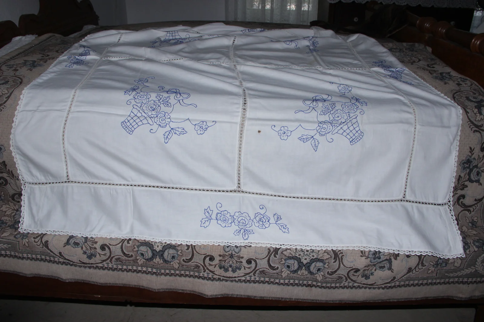 Leírás: Több részből, csipkebetéttel van van összeállítva, kék hímzőszállal száröltéssel hímezve, virágkosaras mintával. Csipkeszegéllyel.