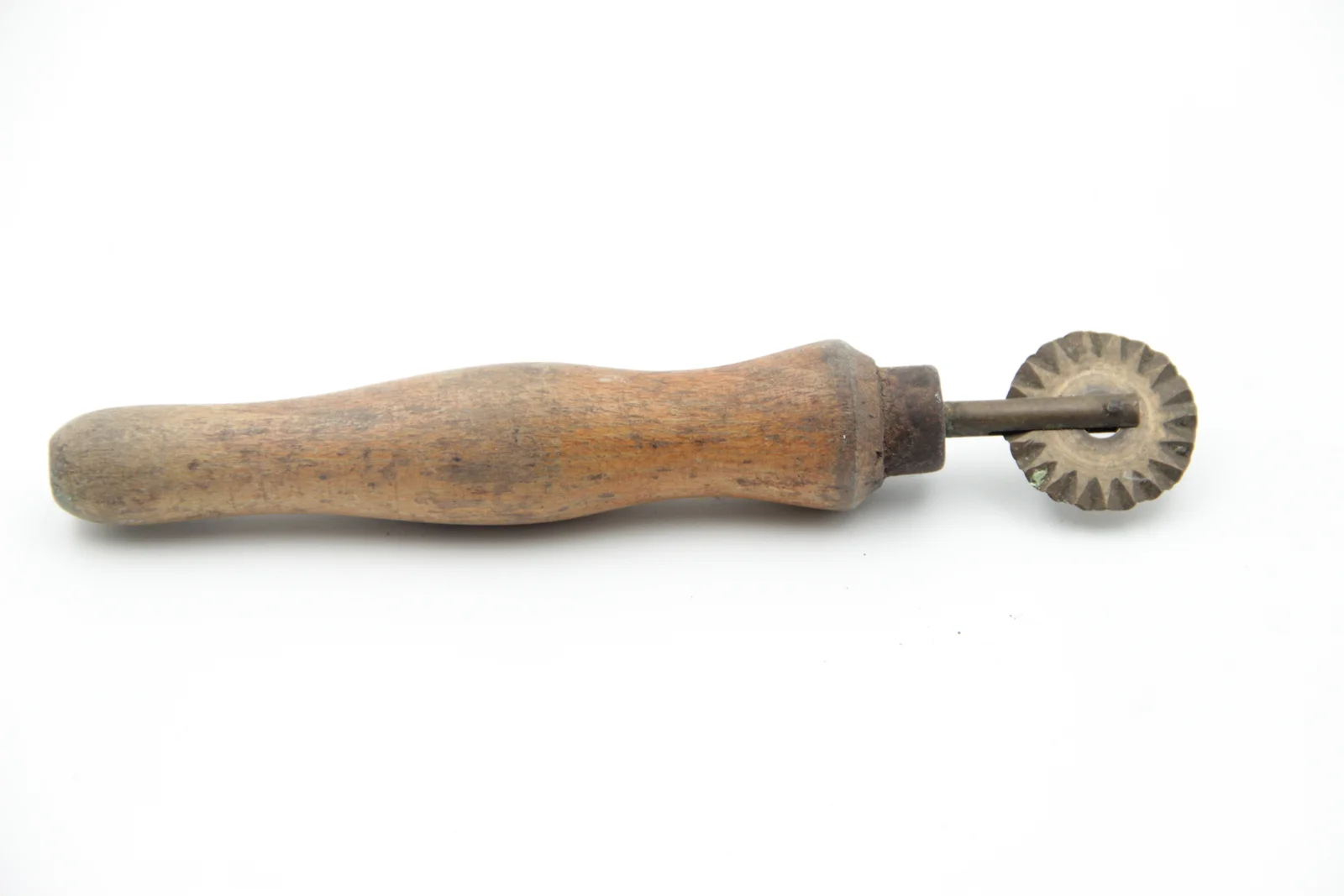Leírás: vastagabb fanyélbe illeszkedik a fém rész, amelynek végén forgó, köralakú, hullámos szélű lemez van.