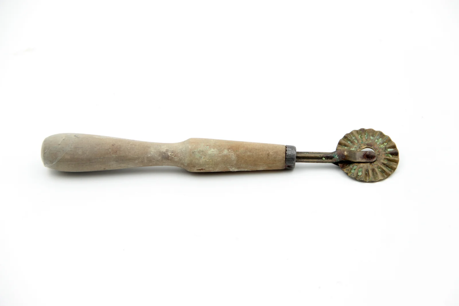Leírás: vékonyabb fanyélbe illeszkedik a fémrész, amelynek végén forgó, köralakú, hullámos szélű lemez van.