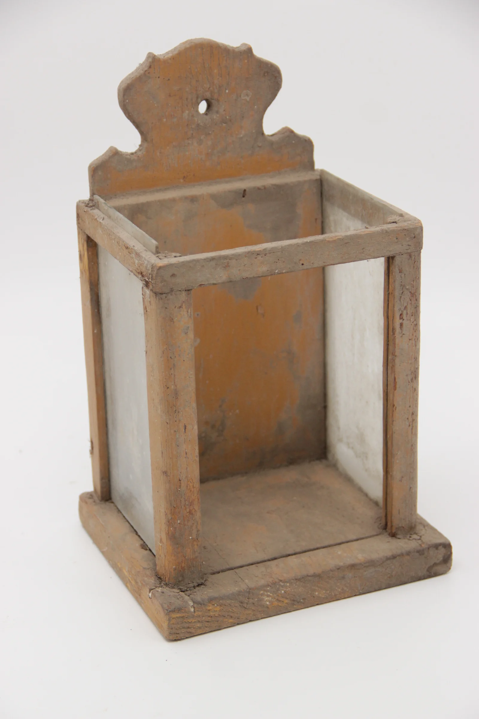Leírás: Hátsó és alsó lapj fa, két oldala üveg, hátsó lapjának felső része díszített. Teteje nincs.