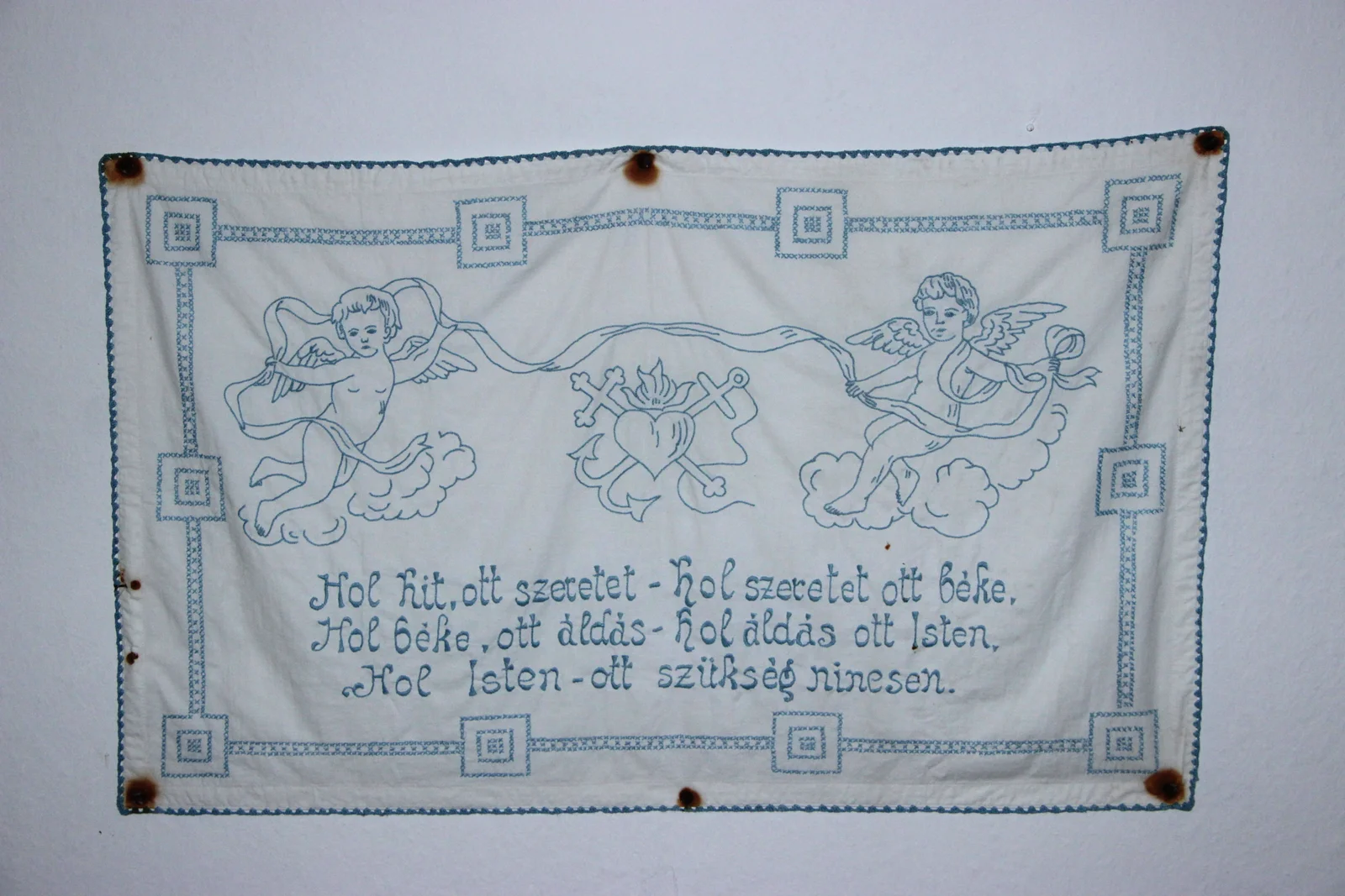 Leírás: Kék hímzőszállal, száröltéssel és keresztöltéssel hímezve, angyalkás motívummal és a háziáldás szövegével.