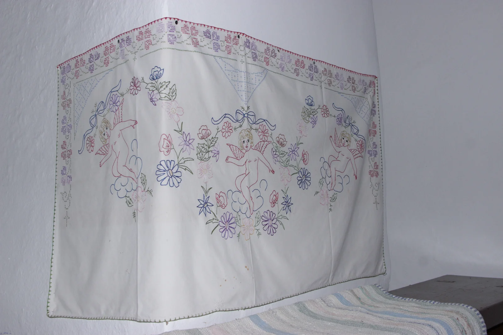 Leírás: Angyalka mintás, keresztszemes és száröltéses technikával készült