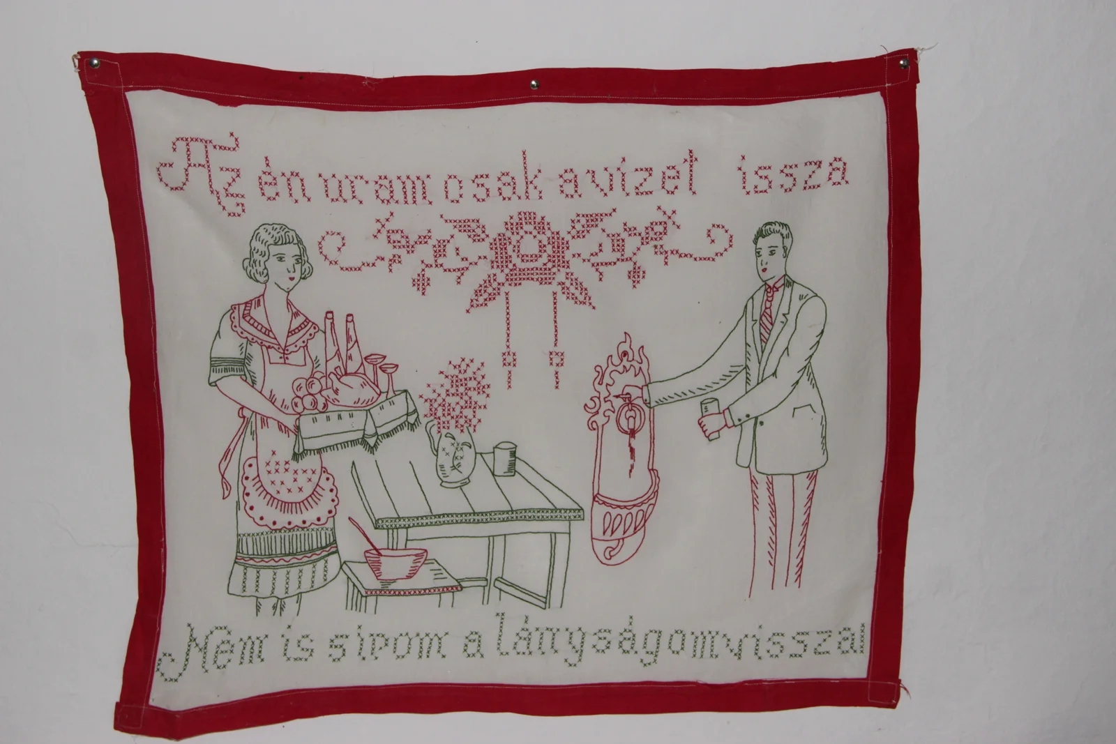 Leírás: Piros és zöld hímzőszállal száröltéssel és keresztszemes öltéssel (nem szálszámolásos) hímezve. Konyhai jelenetet ábrázol. Piros szegélyes. Felirata: "Az én uram csak a vizet issza Nem is sirom a lányságom vissza"