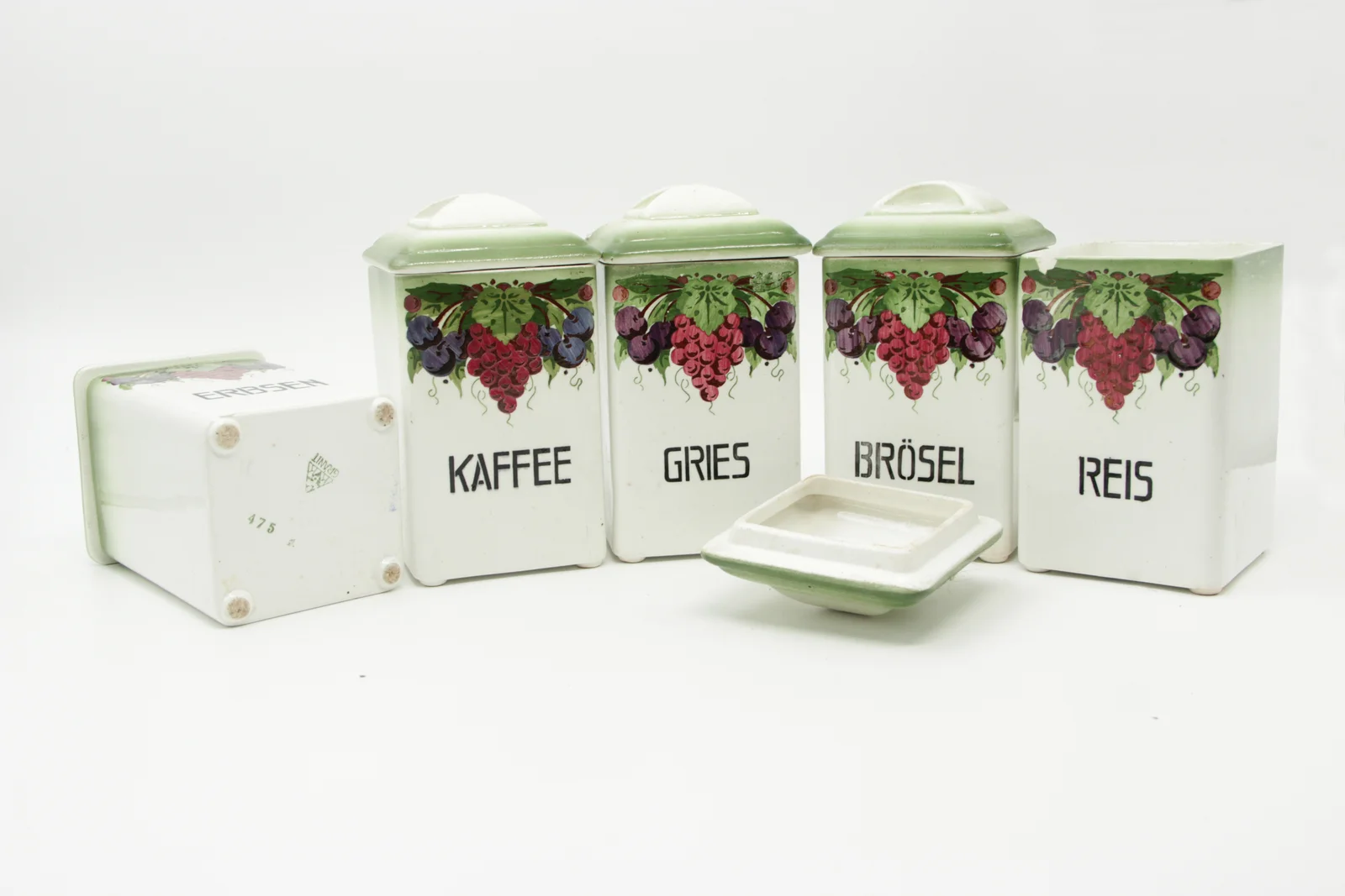 Leírás: 5 darabos garnitúra rizs, borsó, zsemlemorzsa, búzadara és kávé tárolására. Fehér alapon cseresznye- és szőlőmintás, fedeles. Német nyelvű feliratokkal: REIS, ERBSEN, BRÖSEL, GRIES, KAFEE. Fenékjegye: "GRANIT" és háromszög alak.