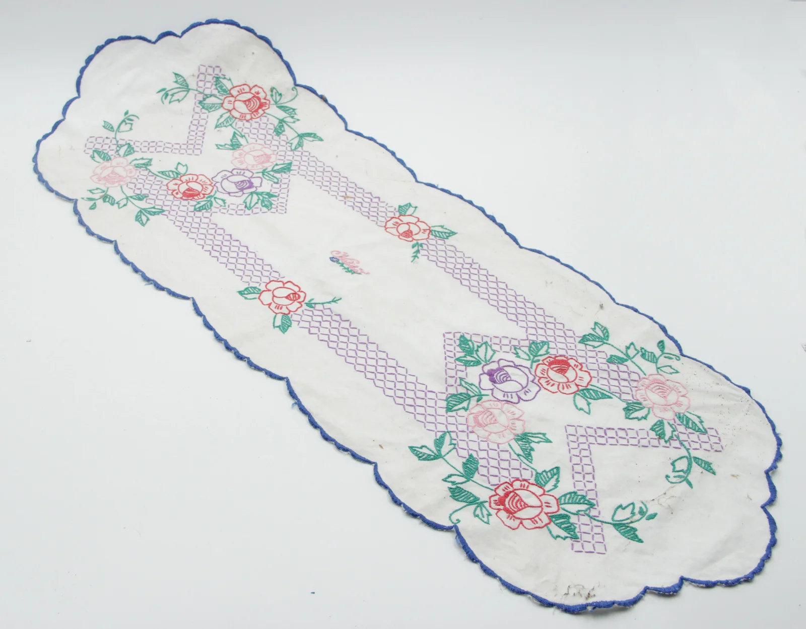 Leírás: Száröltéssel és hamis laposöltéssel, piros, rózsaszín, lila, zöld és sötétkék hímzőfonallal hímezve. Motívuma rózsák rácsszerű mintával. Felirata: "Katóka".