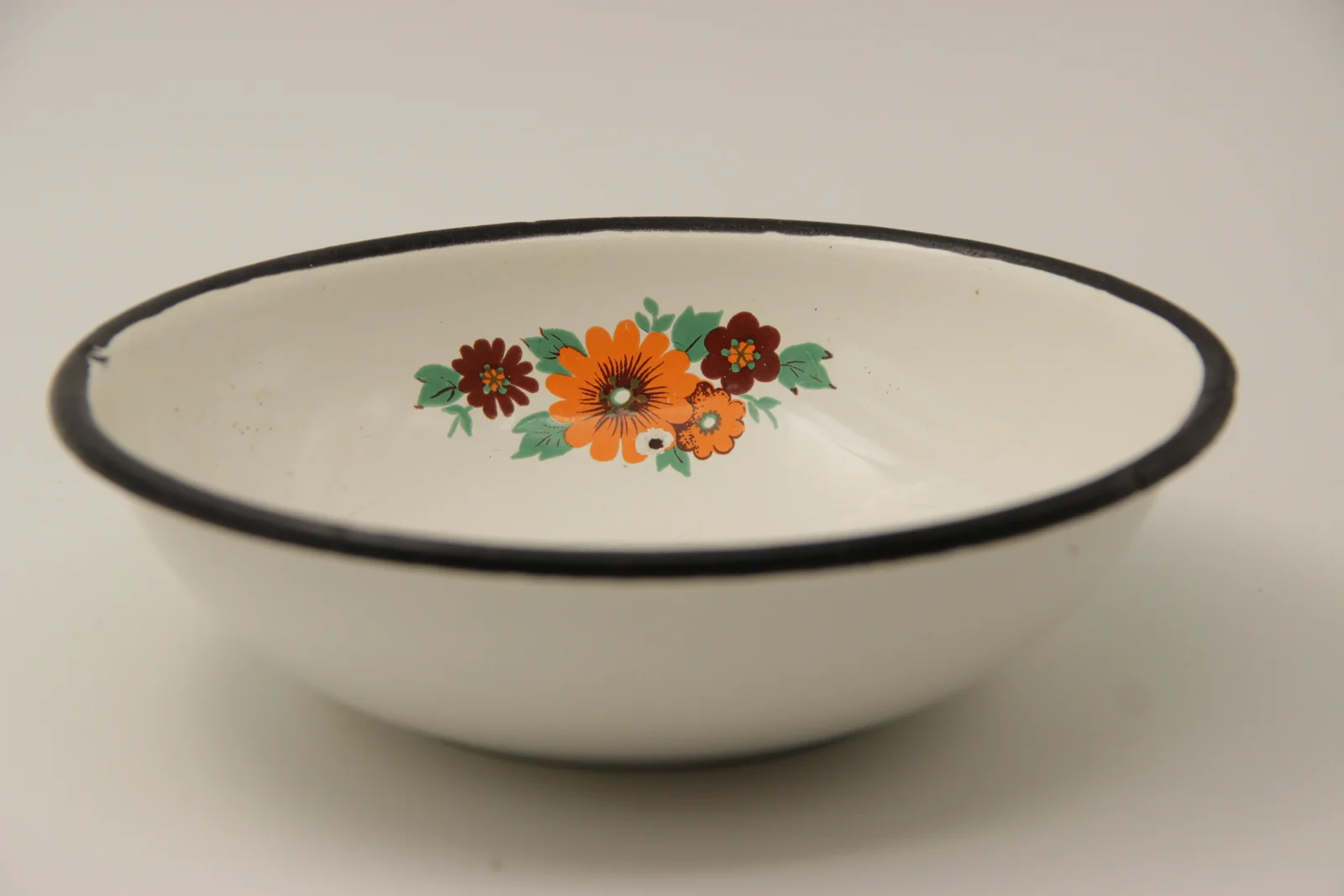 Leírás: Belsejében narancssárga és barna virágminta. Fenékjegye: "EMP 20" és kür alakú pecsét.