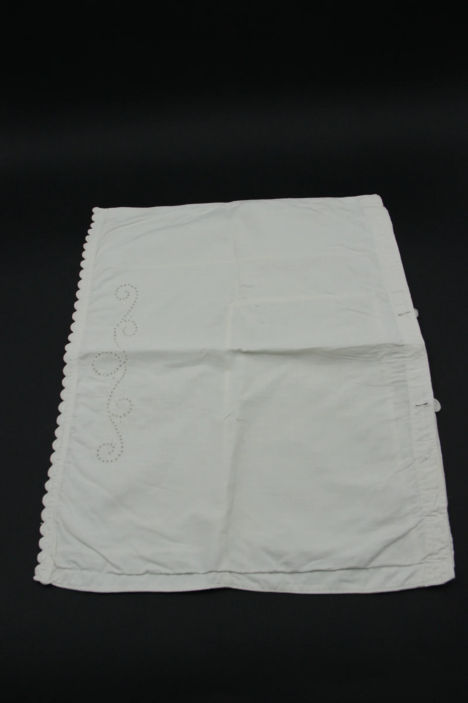 Leírás: A párnalap teteje fehér apró lyukhímzéssel díszített, felső oldalán hullámosan cakkozott, házi cérnagombokkal záródik.