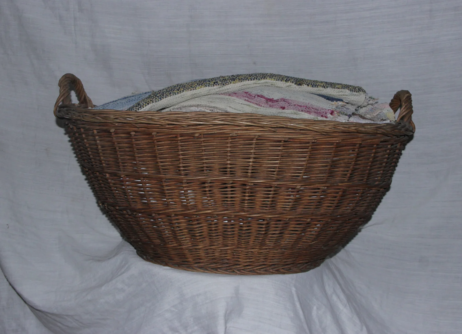 Leírás: két fülű, vesszőből font, ovális kosár