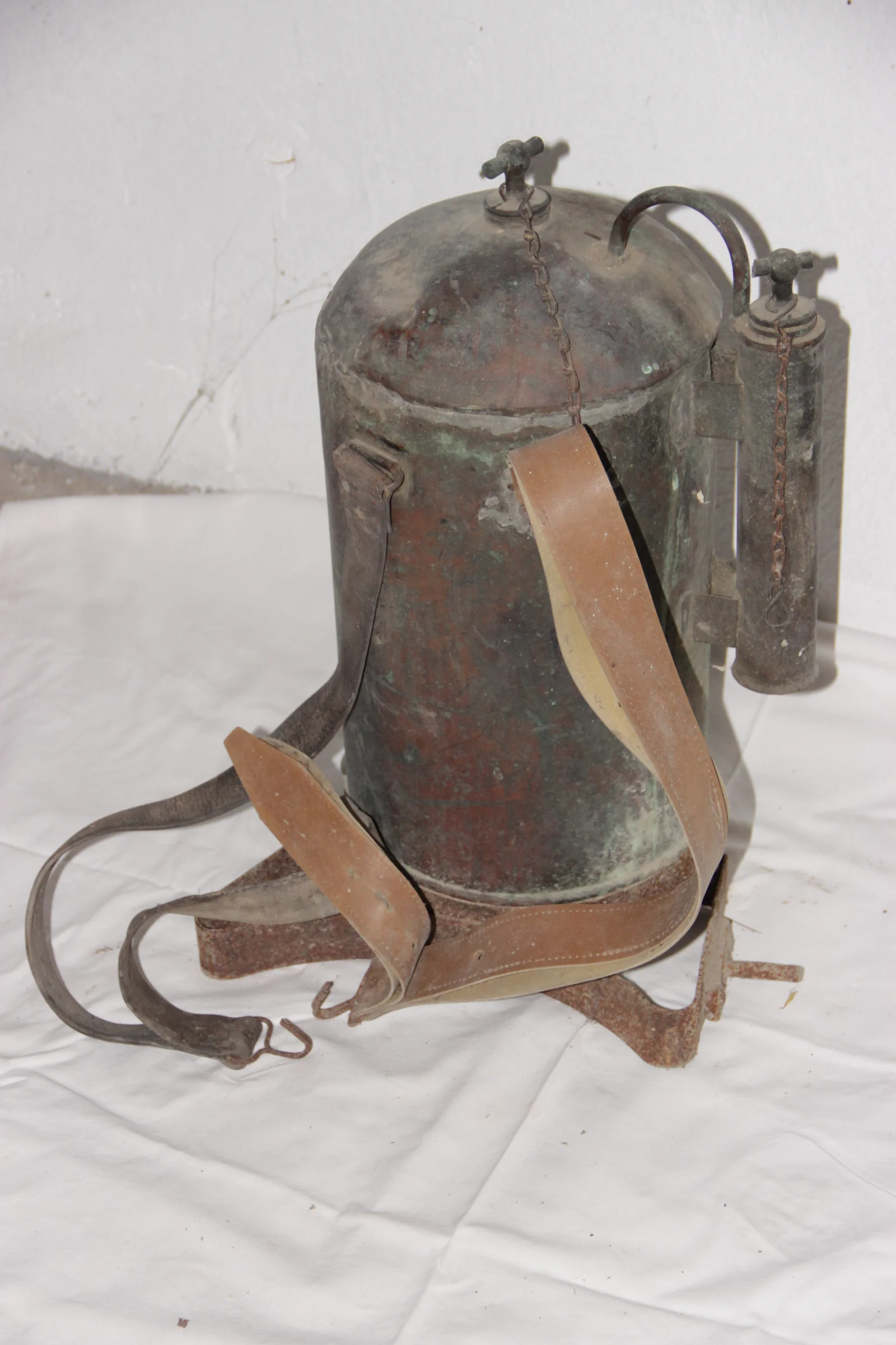 Leírás: Hengeralakú rézpermetező, bőrszíjakkal, alján vaspánt. Hiányzik a pumpáló része.