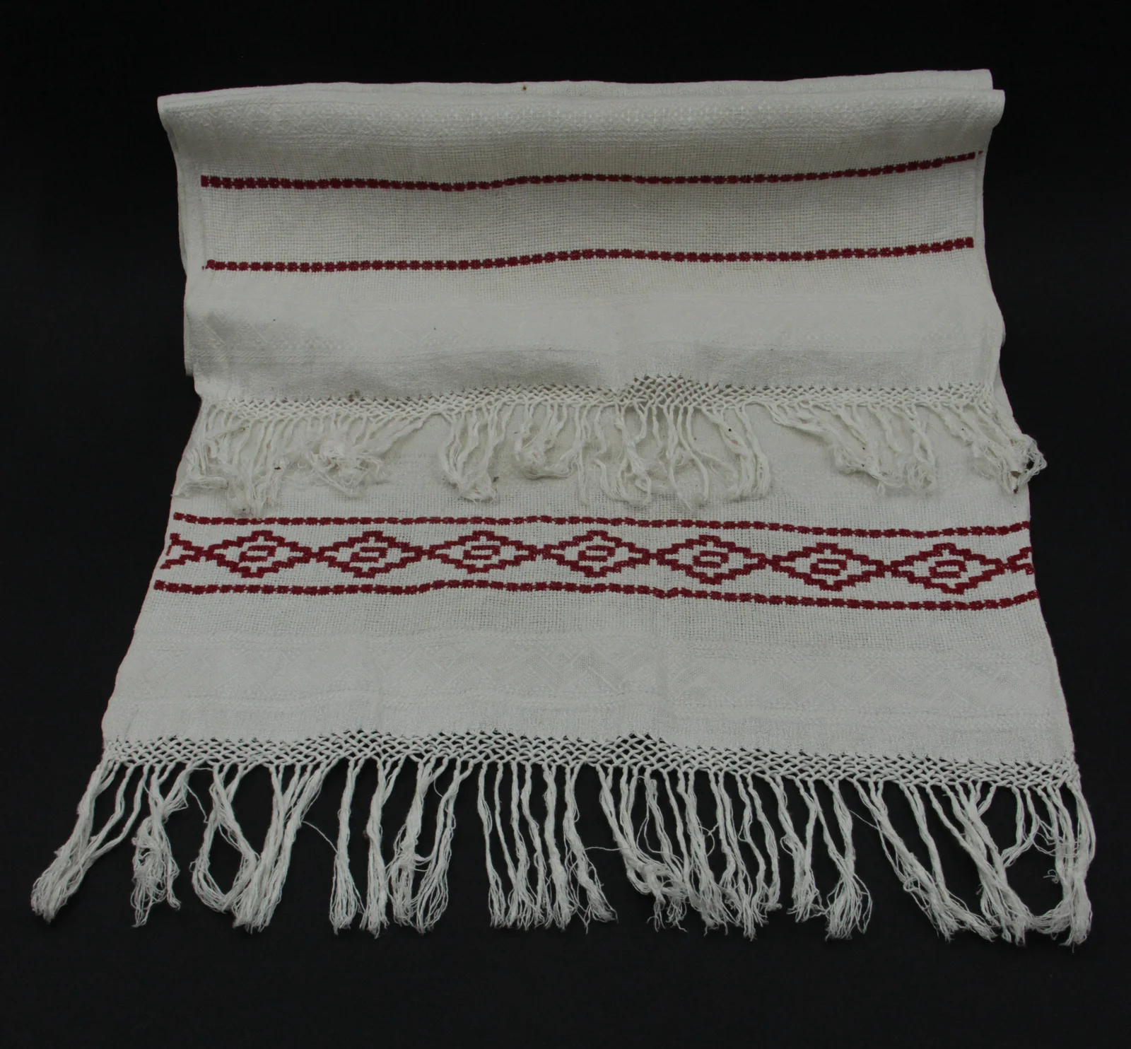 Leírás: Két végén cikk-cakk alakú szövött díszítmény és vörös hímzőszásszal, keresztszemes öltéssel hímzett díszítmény. Vége csomózott, rojtos.