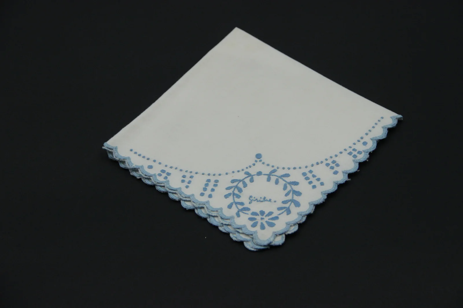 Leírás: kék cérnával hímzett, felirata: Gizike