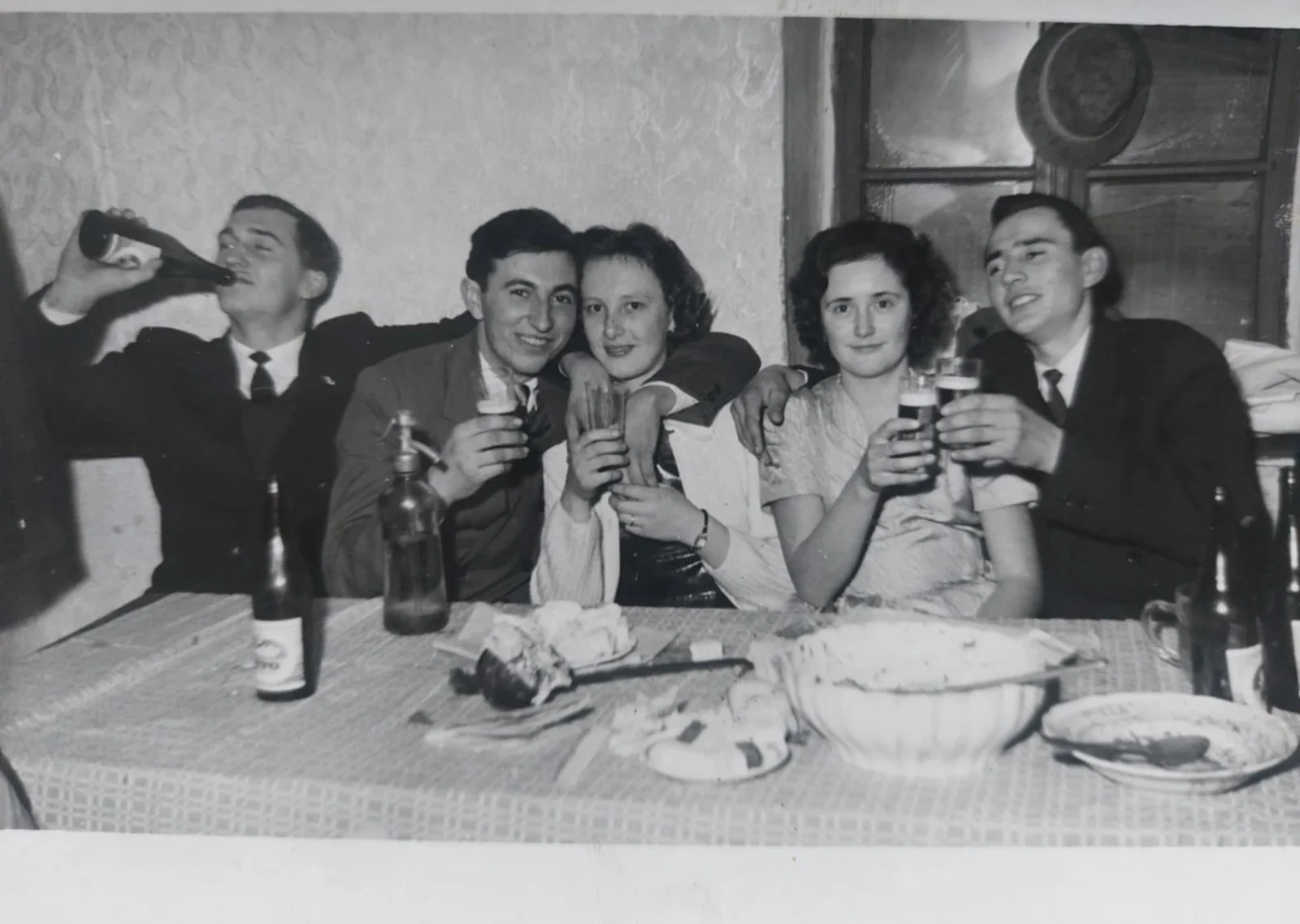 A fotón jobbról az első Bacskó László, mellette a menyasszonya, György Teréz.