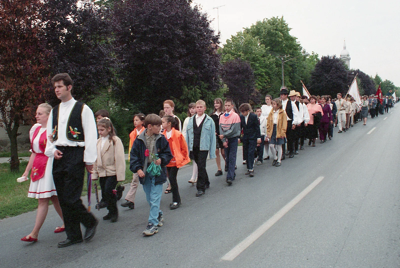 Temerin, Illés-napi menet, útban a Telep városrészben felépített, felszentelésre váró új templom felé, háttérben a fotón a Szent Rozália plébániatemplom tornya
