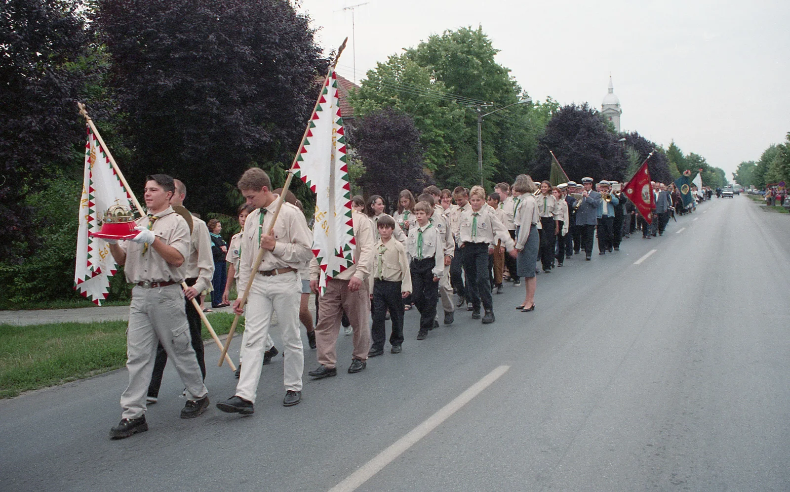 Temerin, Illés-napi menet, útban a Telep városrészben felépített, felszentelésre váró új templom felé, háttérben a fotón a Szent Rozália plébániatemplom tornya