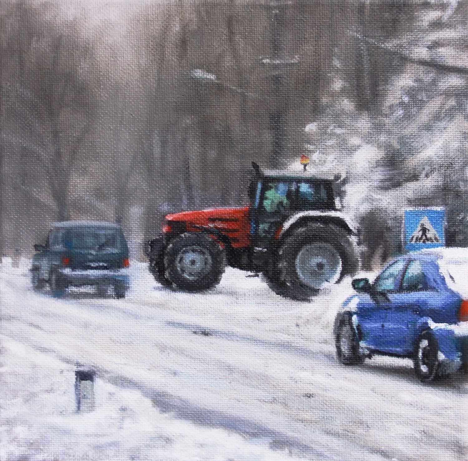 Búzamező varjakkal és traktorral