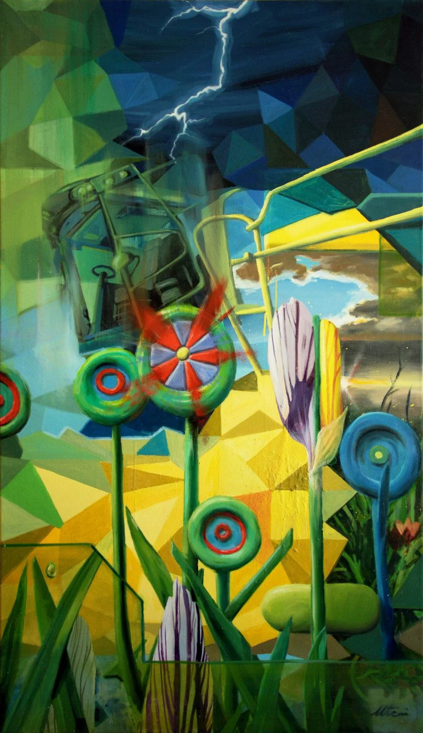 Búzamező varjakkal és traktorral