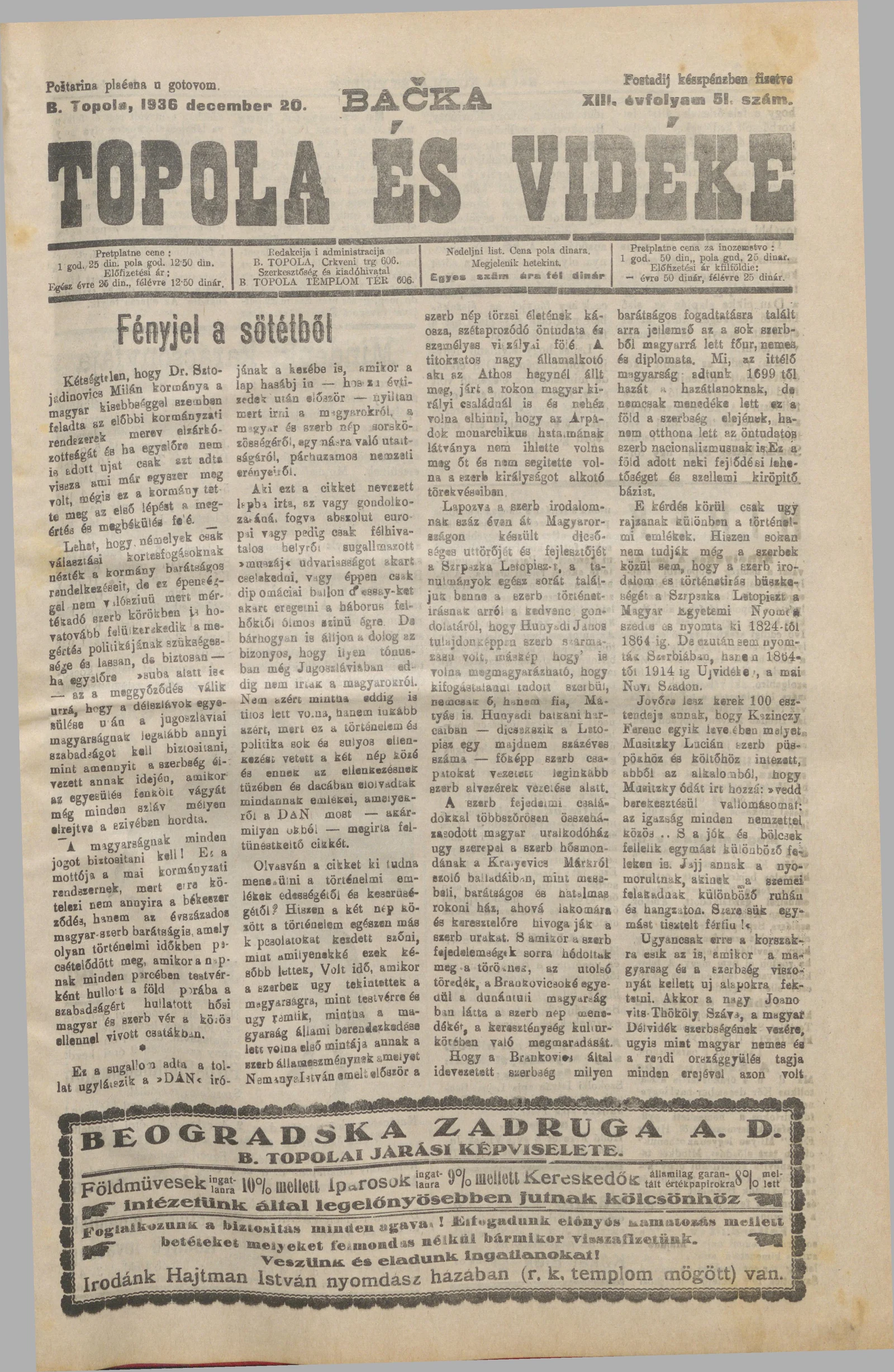Bačka Topola és Vidéke, 13. évf. 1936. december 20. 51. sz.