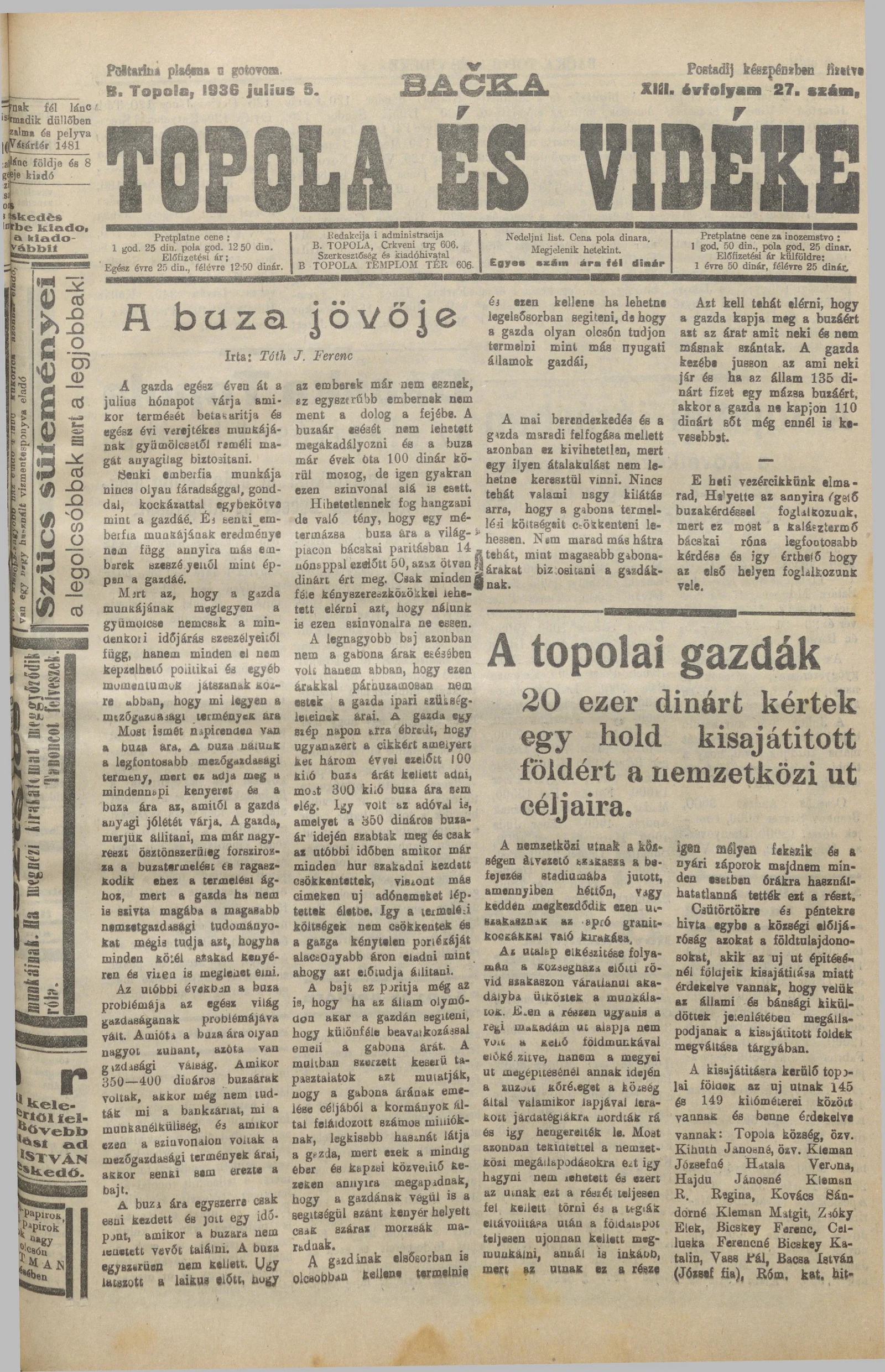 Bačka Topola és Vidéke, 13. évf. 1936. július 5. 27. sz.
