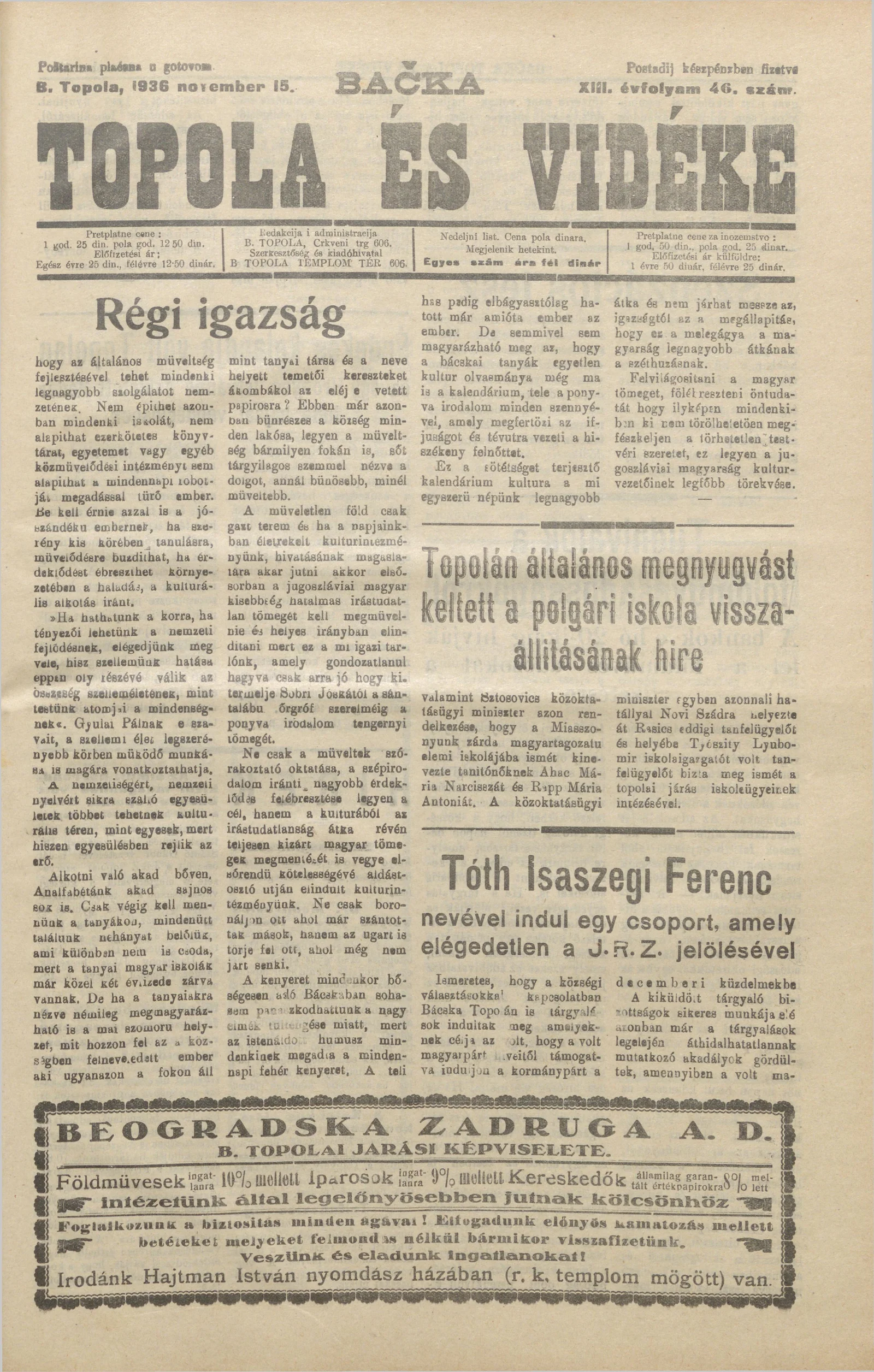 Bačka Topola és Vidéke, 13. évf. 1936. november 15. 46. sz.