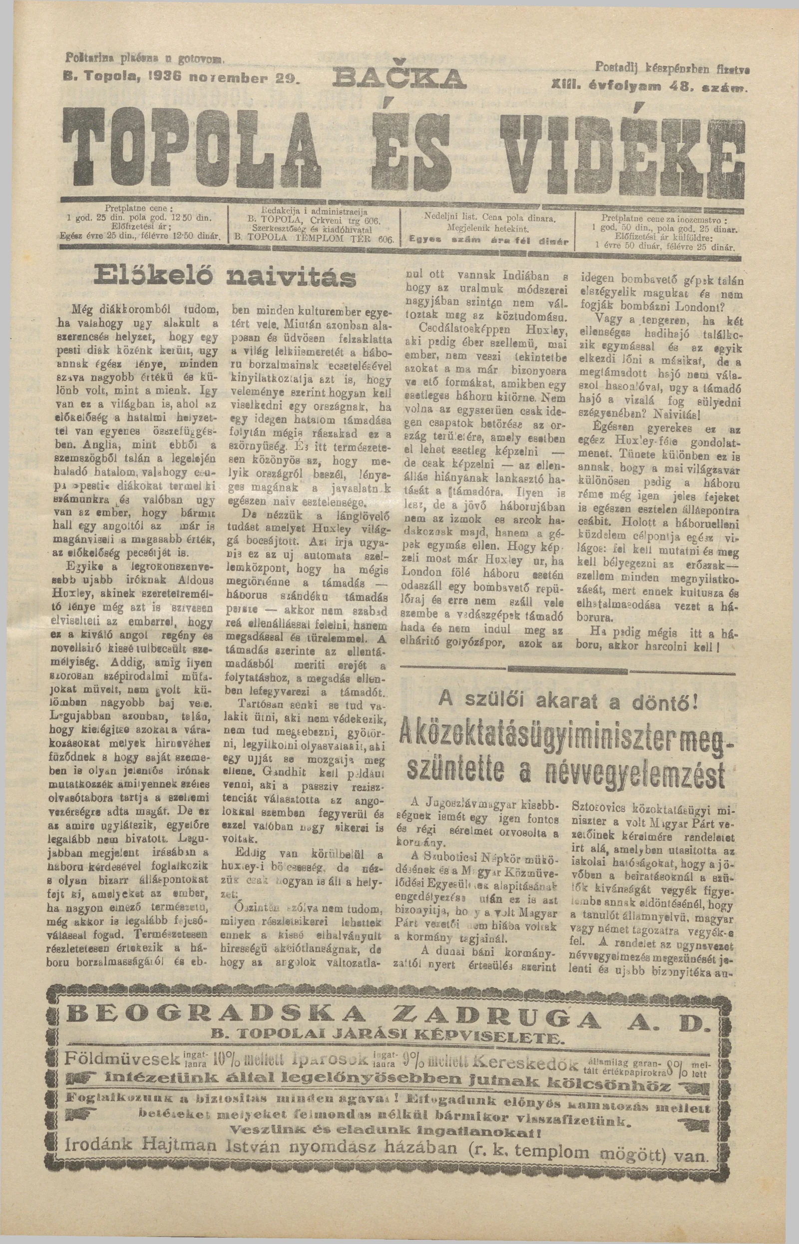 Bačka Topola és Vidéke, 13. évf. 1936. november 29. 48. sz.