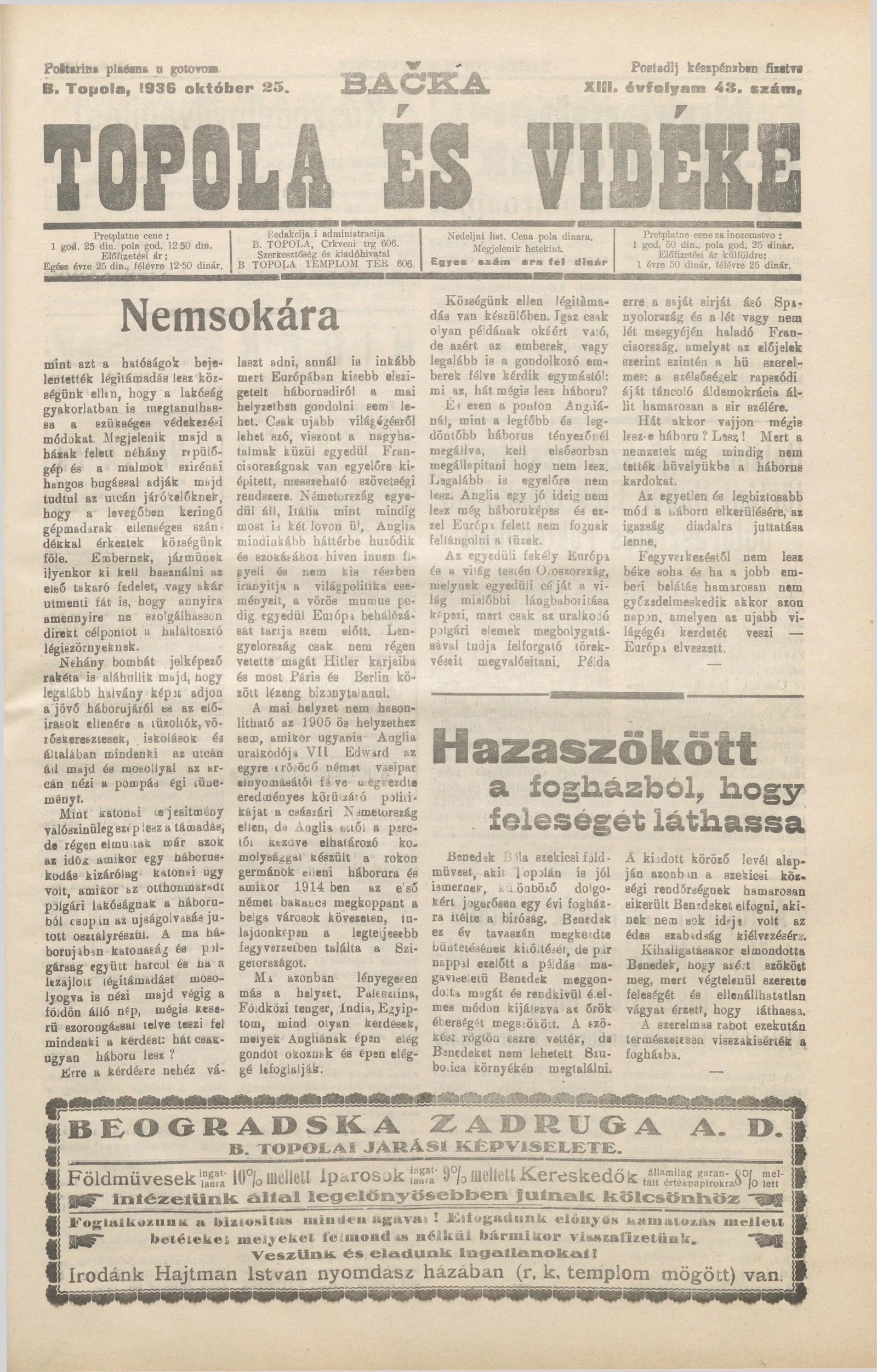 Bačka Topola és Vidéke, 13. évf. 1936. október 25. 43. sz.