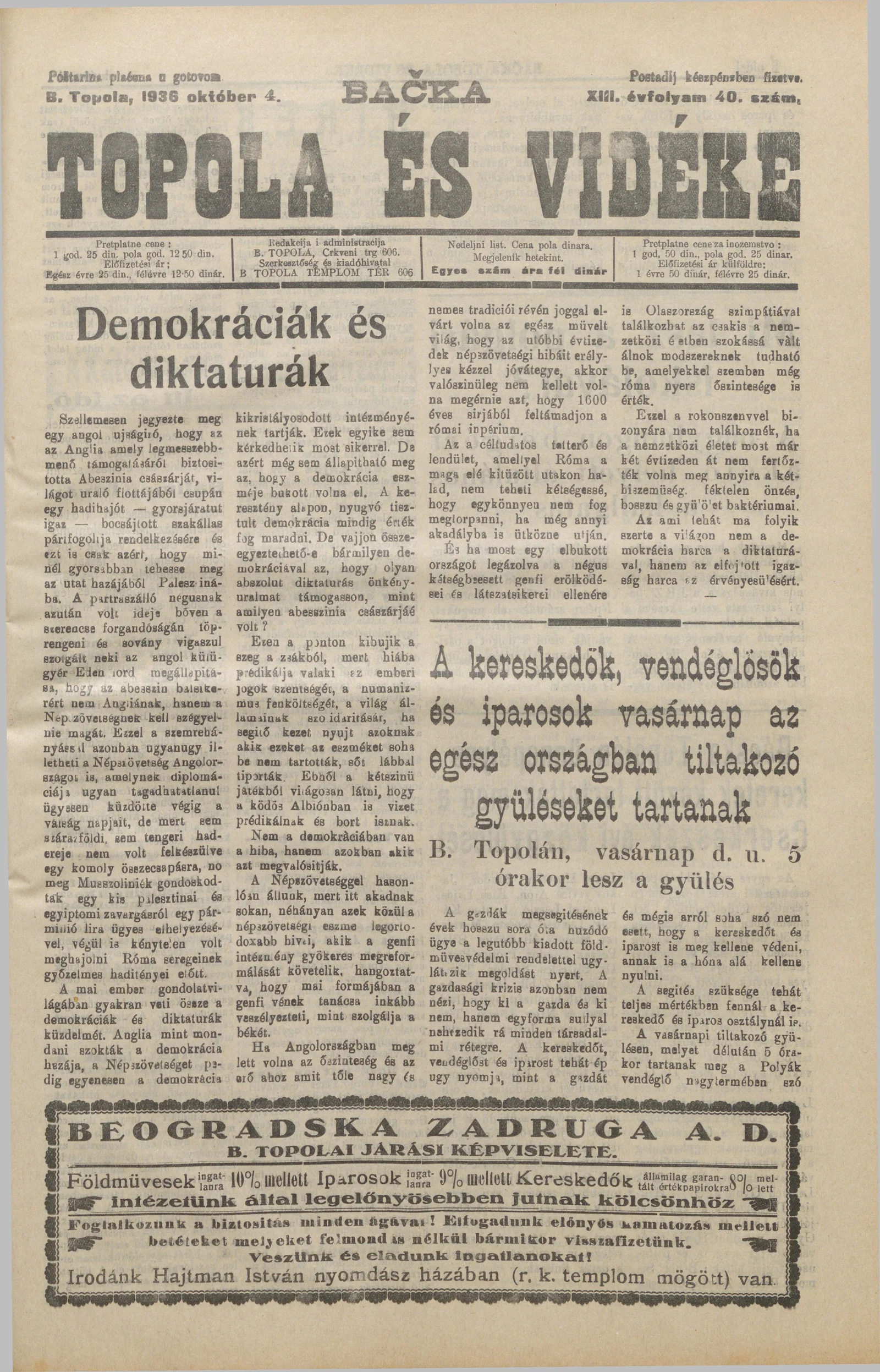 Bačka Topola és Vidéke, 13. évf. 1936. október 4. 40. sz.