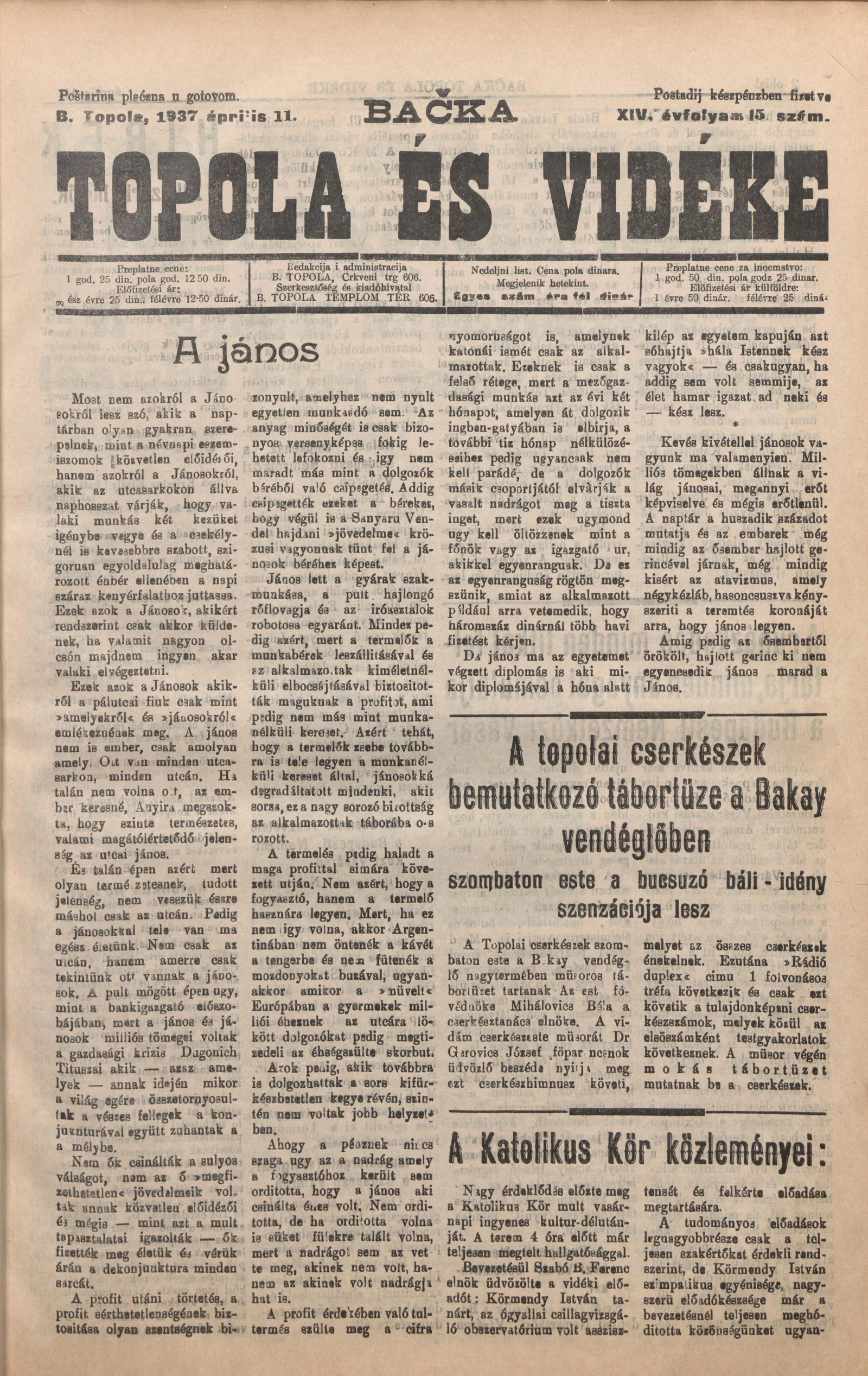 Bačka Topola és Vidéke, 14. évf. 1937. április 11. 15. sz.